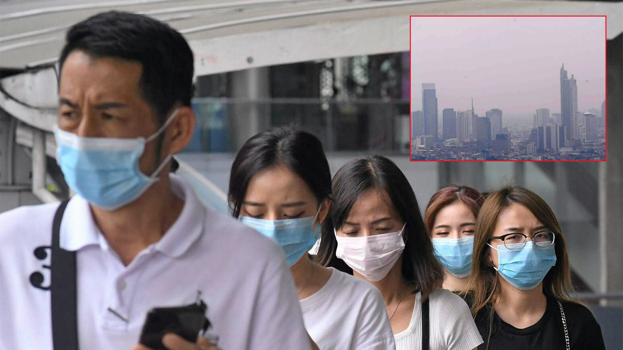 ประชาชนและนักท่องเที่ยวต้องสวมหน้ากากอนามัยป้องกันมลพิษ ระหว่างเดินผ่านสกายวอล์ก บริเวณหน้าเซ็นทรัลเวิลด์ หลังฝุ่นละอองขนาดเล็ก หรือ PM 2.5 ปกคลุมหนาแน่นไปทั่วกรุง (ภาพเล็ก)