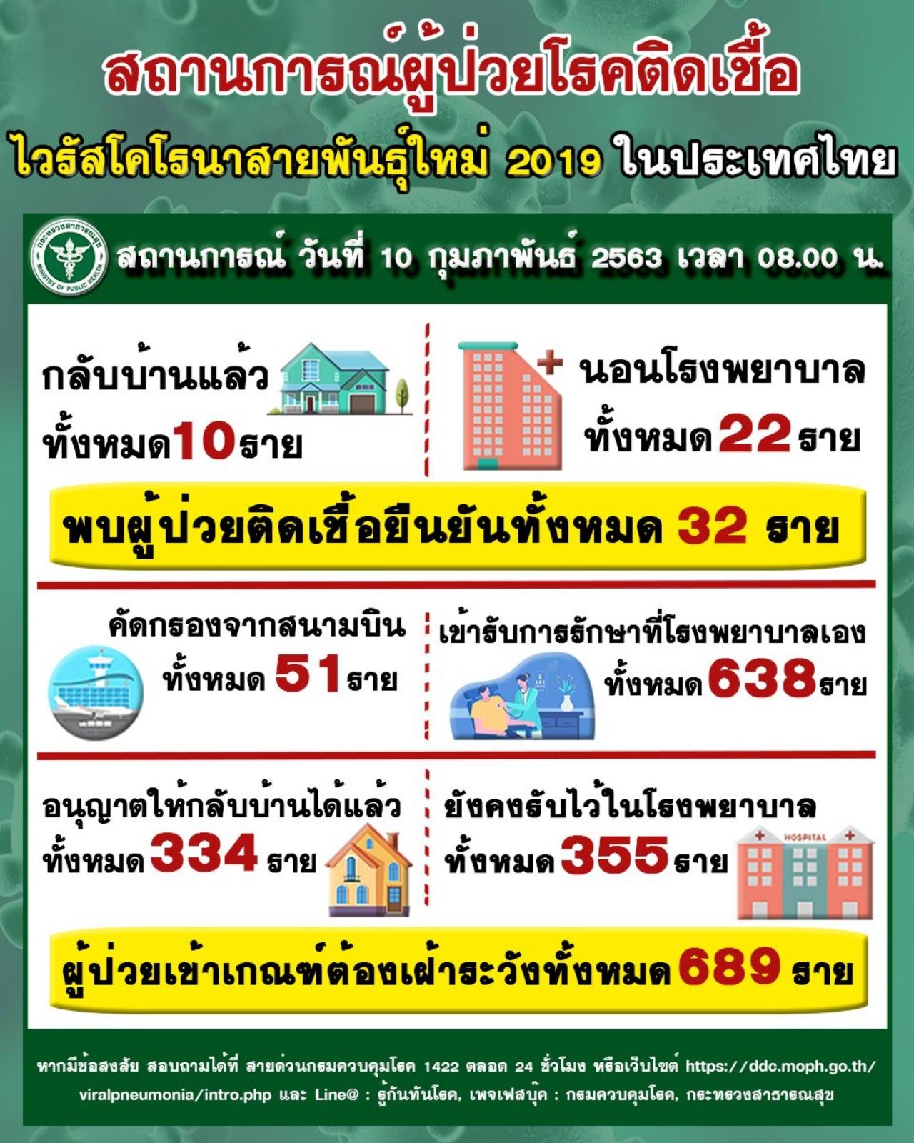 นพ.ทวีศิลป์ ในฐานะโฆษกกระทรวงสาธารณสุข กล่าวว่า สถานการณ์ถึงวันที่ 10 กุมภาพันธ์ 2563 ณ เวลา 08.00 น. ผู้ป่วยยืนยันติดเชื้อรักษาในโรงพยาบาล 22 ราย กลับบ้านแล้ว 10 ราย รวมสะสม 32 ราย ผู้ป่วยเข้าเกณฑ์สอบสวนโรคต้องเฝ้าระวัง ตั้งแต่วันที่ 3 มกราคม - 9 กุมภาพันธ์ 2563 มีผู้ป่วยเข้าเกณฑ์สอบสวนต้องเฝ้าระวังสะสมทั้งหมด 689 ราย คัดกรองจากสนามบิน 51 ราย มารับการรักษาที่โรงพยาบาลเอง 638 ราย อนุญาตให้กลับบ้านได้แล้ว 334 ราย ส่วนใหญ่เป็นไข้หวัดใหญ่ตามฤดูกาล ยังคงรักษาในโรงพยาบาล 355 ราย ขณะที่สถานการณ์ทั่วโลกใน 26 ประเทศ ข้อมูลตั้งแต่ 5 มกราคม-9 กุมภาพันธ์ 2563 พบผู้ป่วยยืนยันติดเชื้อ จำนวน 40,553 ราย เสียชีวิต 909 ราย ส่วนประเทศจีน พบผู้ป่วย 40,171 ราย เสียชีวิต 907 ราย