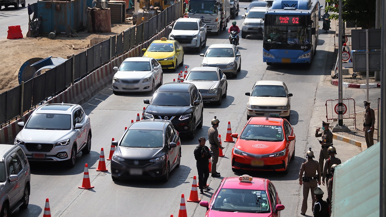 บรรยากาศด่านตรวจคัดกรองหาผู้ติดเชื้อไวรัสโควิด-19 ที่เดินทางจากปริมณฑลมุ่งหน้าเข้า กทม. ริมถนนแจ้งวัฒนะ ฝั่งขาเข้า ถือเป็นวันแรกการบังคับใช้ พ.ร.ก.ฉุกเฉิน แต่ทำได้ไม่นานต้องยกเลิก เพราะรถติดอย่างหนัก.