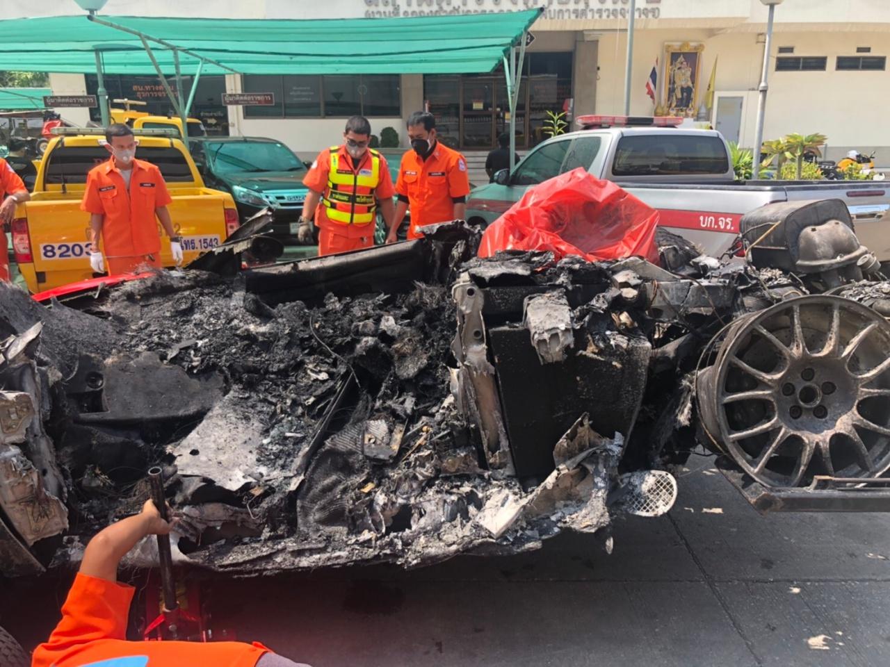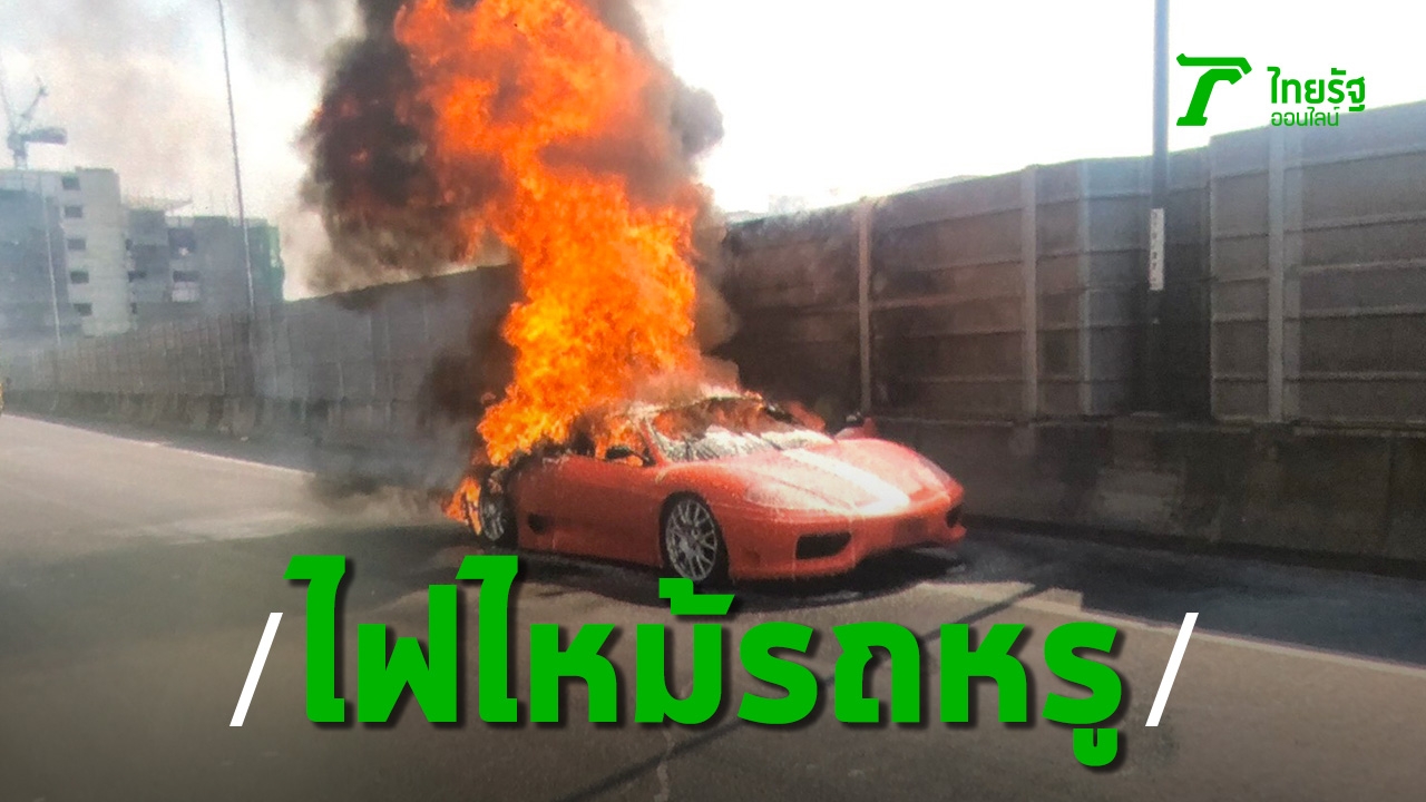 หนุ่มใหญ่ขับเฟอร์รารี่ป้ายแดง อยู่ระหว่างเทสต์ไดรฟ์ น้ำมันรถรั่วเพลิงไหม้ทั้งคัน บนทางด่วนศรีรัช ฝั่งขาออก โชคดีกระโดดออกจากรถได้ทัน