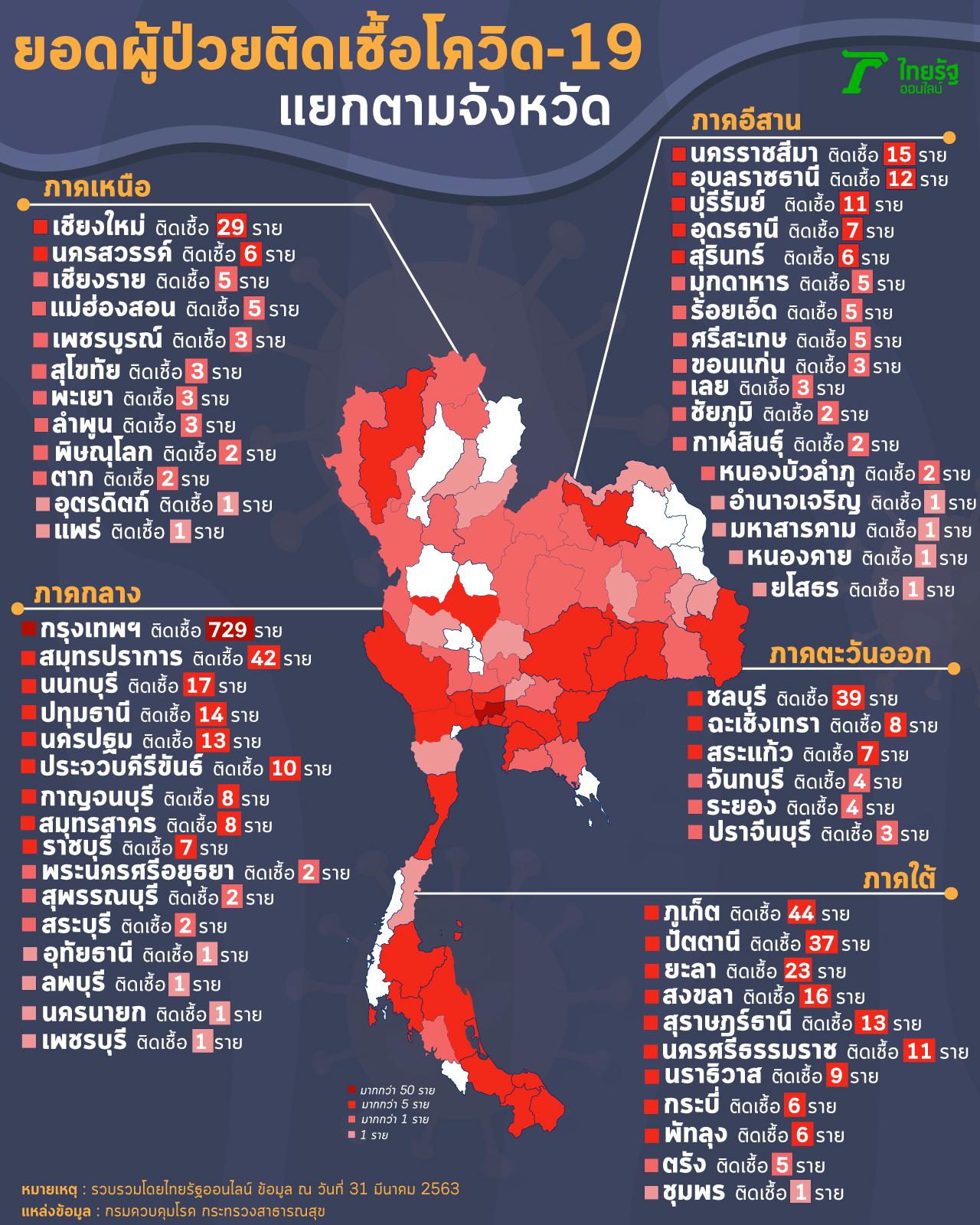 - ประเทศไทยสถานการณ์ยังน่าห่วง ล่าสุดยอดผู้ติดเชื้อโควิด-19 เพิ่มขึ้น 127 ราย ยอดผู้ติดเชื้อสะสม 1,651 ราย เสียชีวิตเพิ่ม 1 ศพ รวมผู้เสียชีวิต 10 ศพ โดยกทม.พบผู้ติดเชื้อรายใหม่มากที่สุด และขณะนี้มีผู้ติดเชื้อกระจายไปทั่ว 61 จังหวัดแล้ว