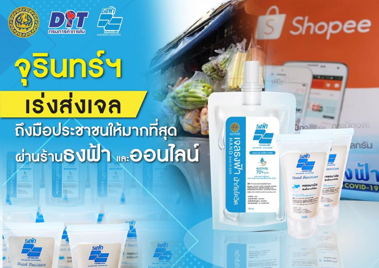 กระทรวงพาณิชย์ เตรียมส่งเจลล้างมือธงฟ้าลอตแรก 1 ล้านชิ้น จำหน่ายให้ผู้บริโภคผ่านร้านธงฟ้า รถธงฟ้า และแพลตฟอร์มออนไลน์ ช้อปปี้ ดีเดย์สัปดาห์นี้ ช่วยประชาชนเข้าถึงอุปกรณ์ป้องกันไวรัสโควิด-19 แก้ปัญหาการขาดแคลนและฉวยโอกาสปรับขึ้นราคา ด้าน “จุรินทร์” มั่นใจเจลและแอลกอฮอล์ทะลักแน่ หลังสรรพสามิตปลดล็อก ทำให้ผู้ผลิตเร่งผลิตกันเต็มที่ ย้ำหากประชาชนพบเห็นการกักตุน โก่งราคา ให้ร้องเรียนทันที