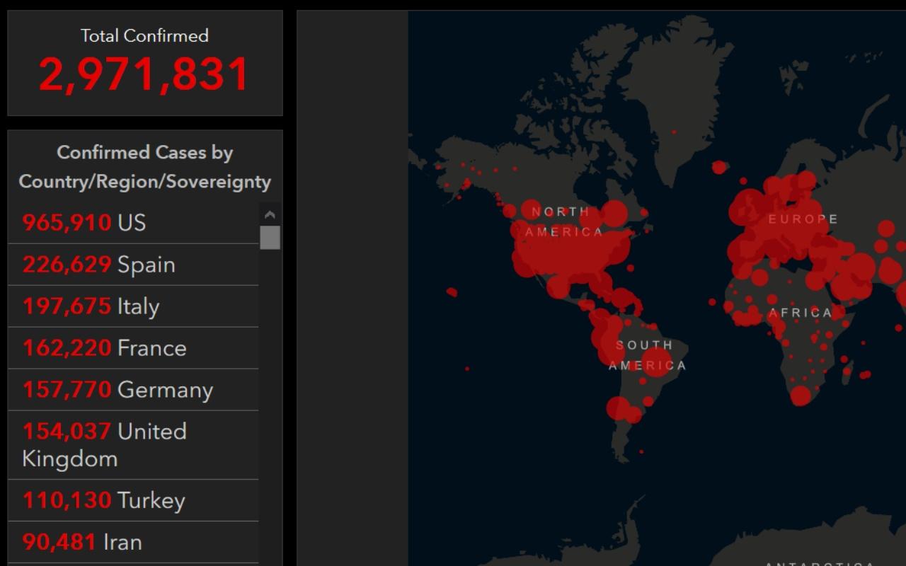 ภัยพิบัติของชาวโลก ต้องเผชิญกับการแพร่ระบาดของเชื้อไวรัสโควิด-19 ที่มิอาจล่วงรู้จะจบเมื่อใด เพราะขณะนี้ยอดผู้ติดเชื้อทะยานเกือบ 3 ล้านราย อยู่ที่ 2,971,831 ราย เสียชีวิตทั้งสิ้น 206,553 ศพ รักษาหายแล้ว 868,480 ราย จากการรายงานของศูนย์วิทยาศาสตร์และวิศวกรรมเชิงระบบ (CSSE) มหาวิทยาลัยจอห์น ฮอปกินส์ เมื่อเวลา 12.31 น. วันที่ 27 เม.ย.