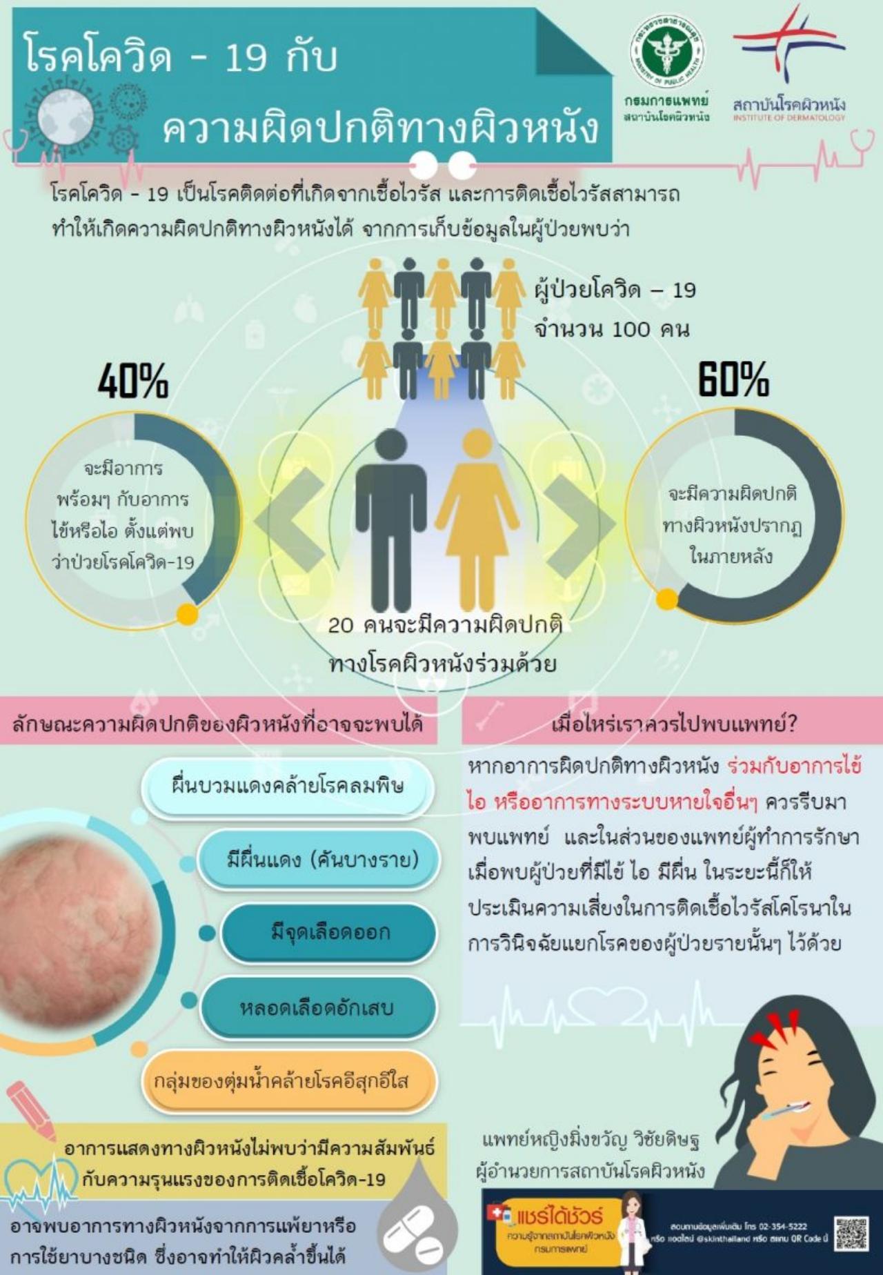นายแพทย์สมศักดิ์ อรรฆศิลป์ อธิบดีกรมการแพทย์ กล่าวถึงในปัจจุบันที่ทั่วโลกกำลังเผชิญกับวิกฤติโรคระบาดไวรัสโคโรนา หรือ โควิด-19 ซึ่งในสื่อออนไลน์ประชาชนได้มีการแชร์ข้อมูลและมีประเด็นถกเถียงกันเกี่ยวกับความผิดปกติทางผิวหนัง เป็นอาการใหม่ของโรคโควิด-19 จากข้อสงสัยดังกล่าวมีการเก็บข้อมูลผู้ป่วยโรคโควิด-19 จากต่างประเทศ เช่น อิตาลี สหรัฐอเมริกา และในประเทศไทยเอง พบว่าร้อยละ 20 ของผู้ป่วย จะมีความผิดปกติทางผิวหนังร่วมด้วย ได้แก่ มีผื่นแดง (คันบางราย) จุดเลือดออก ผื่นบวมแดงคล้ายโรคลมพิษ กลุ่มของตุ่มน้ำคล้ายโรคอีสุกอีใส และการอักเสบของผิวหนังที่เกิดจากการหดและขยายตัวของหลอดเลือด