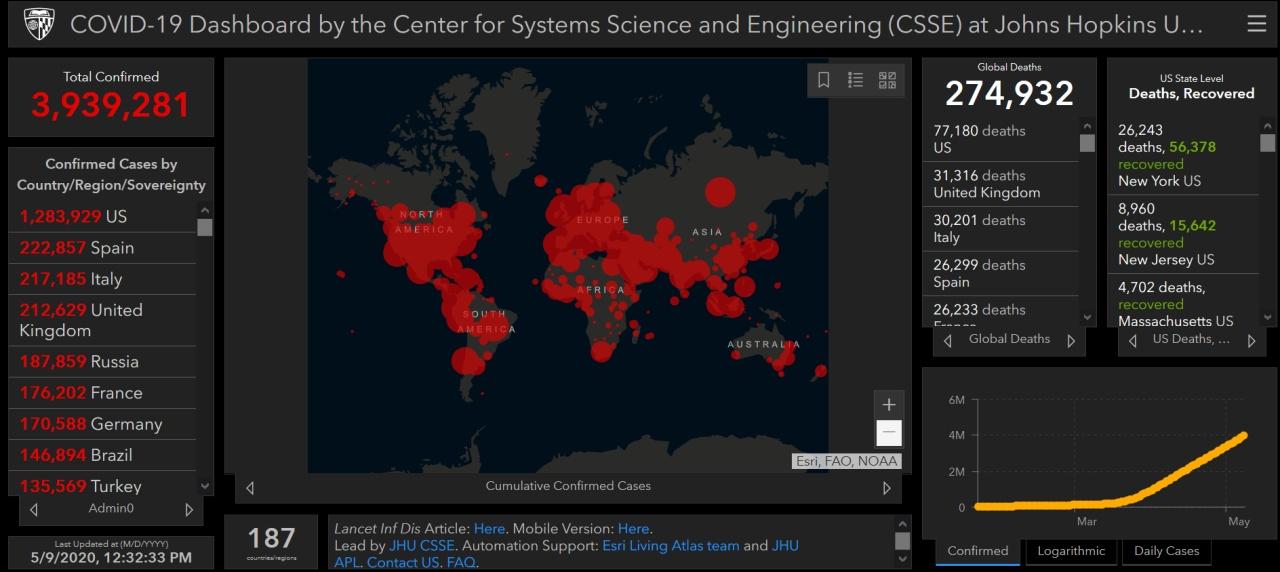 ตัวเลขผู้ติดเชื้อไวรัสโควิด-19 จากทั่วโลกใกล้แตะ 4 ล้านรายแล้ว โดยผู้ติดเชื้อเพิ่มขึ้นมาอยู่ที่ 3,939,281 ราย รักษาหาย 1,323,960 ราย เสียชีวิตเพิ่มขึ้น 5 พันกว่าศพ ภายในรอบ 24 ชั่วโมง มาอยู่ 274,932 ศพ จากการรายงานของศูนย์วิทยาศาสตร์และวิศวกรรมเชิงระบบ (CSSE) มหาวิทยาลัยจอห์นส ฮอปกินส์ เมื่อเวลา 12.32 น. วันที่ 9 พ.ค.