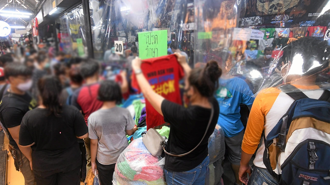 บรรยากาศที่ตลาดนัดจตุจักรที่เปิดเป็นสัปดาห์ที่ 2 คึกคักไปด้วยผู้คนเข้ามาจับจ่ายซื้อของโดยไม่ลืมสวมหน้ากากอนามัย แต่ตามซอยพื้นที่แคบคนเบียดเสียดจนไม่อาจเว้นระยะห่างตามมาตรการป้องกันการแพร่เชื้อโรคได้.