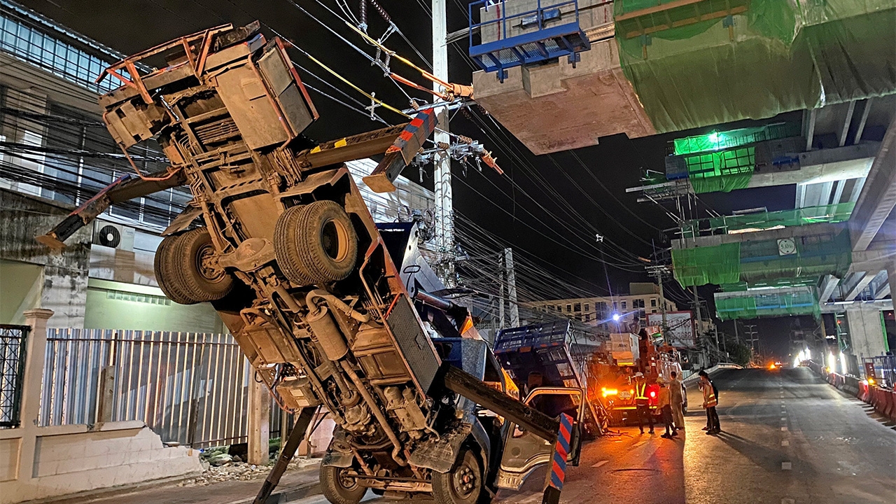 สภาพรถเครนยกกระเช้า สีฟ้า ทะเบียน 77-0003 กรุงเทพมหานคร เสียหลักจนตัวรถหัวทิ่มท้ายชี้ฟ้า ขณะยกกระเช้านำคนงานขึ้นไป ก่อสร้างสถานีรถไฟฟ้า ทำให้คนงานพม่าร่วงลงมาบาดเจ็บ 2 คน เหตุเกิดที่เชิงสะพานข้ามคลองบางบัว ถนนแจ้งวัฒนะ ฝั่งมุ่งหน้าถนนวิภาวดีรังสิต.