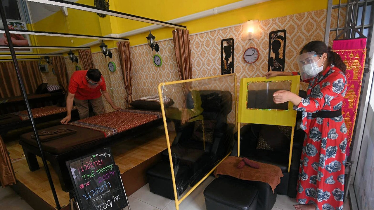 น.ส.กัญญาภัคร์ สาสาย เจ้าของร้านกัญญาภัคร์ ร้านนวดแผนโบราณย่านปิ่นเกล้า โชว์แผ่นฟิวเจอร์บอร์ดและท่อพีวีซี ที่ประดิษฐ์ขึ้นมาเองทำเป็นฉากกั้นลูกค้ากับหมอนวด เพื่อป้องกันติดเชื้อ.