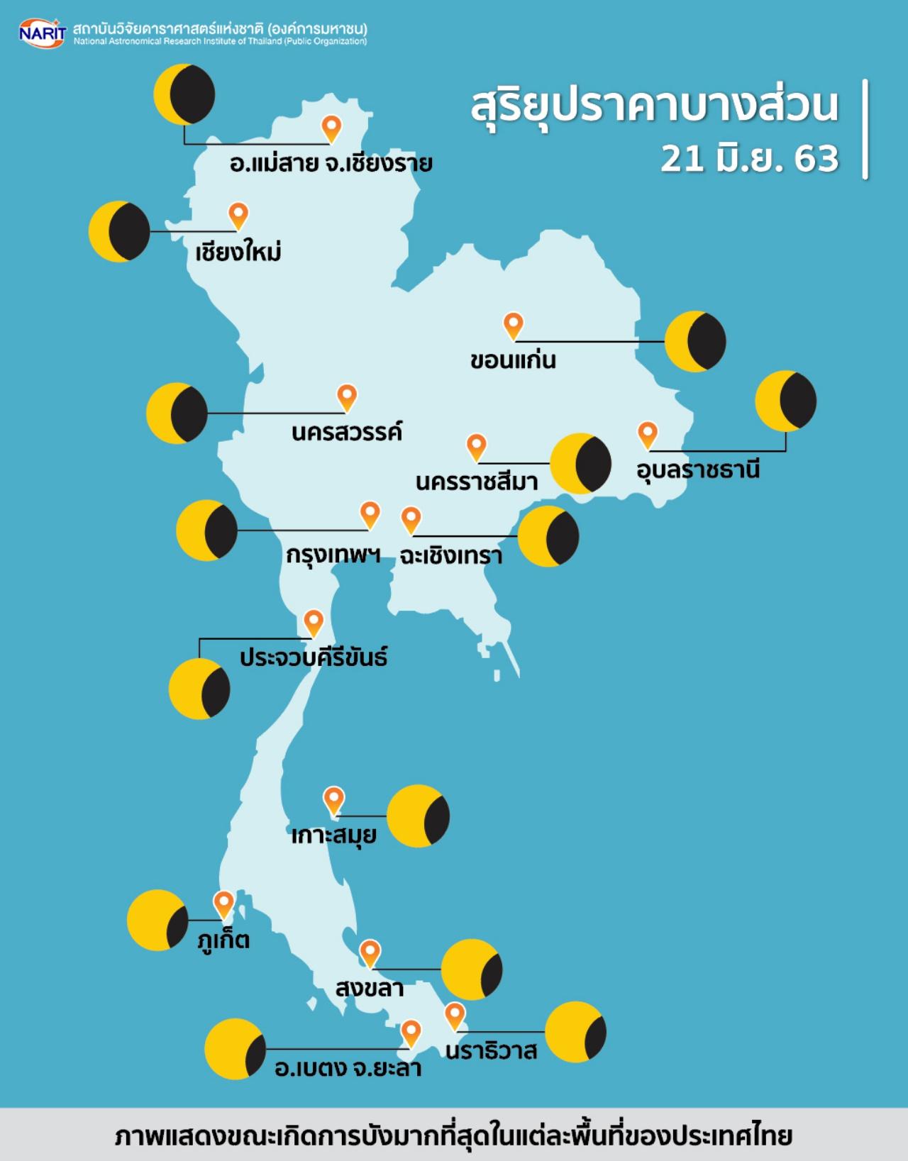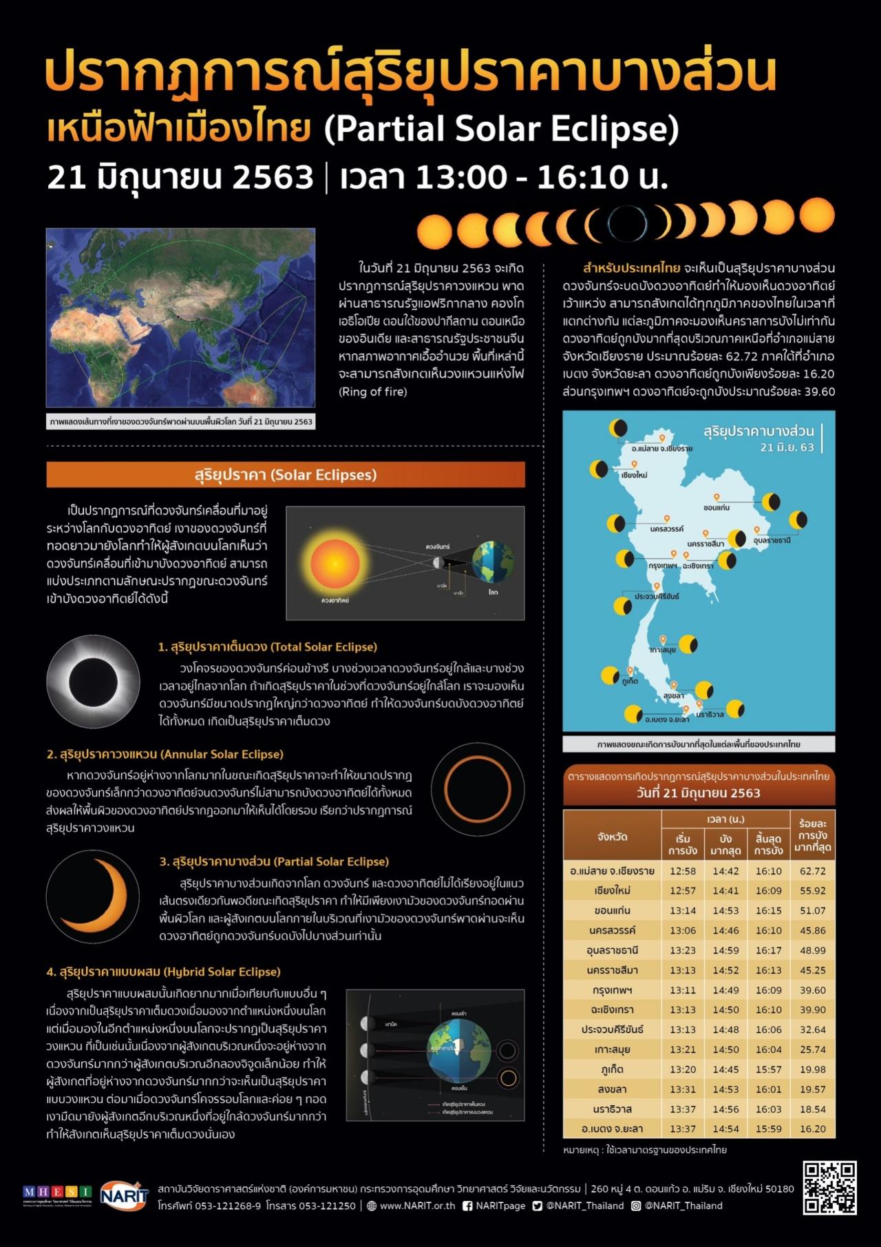 สถาบันวิจัยดาราศาสตร์แห่งชาติ (องค์การมหาชน) (สดร.) กระทรวงการอุดมศึกษา วิทยาศาสตร์ วิจัยและนวัตกรรม (อว.) ชวนชาวไทยชม “สุริยุปราคาบางส่วนเหนือฟ้าเมืองไทย” 21 มิถุนายน 2563 เวลาประมาณ 13.00 - 16.10 น. ภาคเหนือเห็นดวงอาทิตย์เว้าแหว่งมากที่สุด แนะชมผ่านอุปกรณ์กรองแสง ห้ามดูด้วยตาเปล่า หรือแว่นกันแดดโดยเด็ดขาด เตรียมถ่ายทอดสดปรากฏการณ์จากหอดูดาวภูมิภาคทางเพจเฟซบุ๊ก