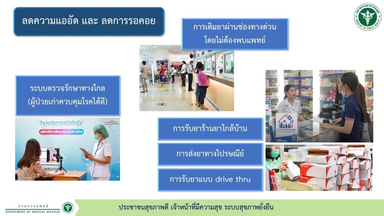 - การรับยาผ่านช่องทางด่วนในกรณีนัดที่ไม่ต้องพบแพทย์ การรับยาร้านยาใกล้บ้าน การส่งยาทางไปรษณีย์ การรับยาแบบ Drive Thru หรือ อสม.ส่งยาถึงบ้าน ขึ้นกับความพร้อมของแต่ละหน่วยบริการ