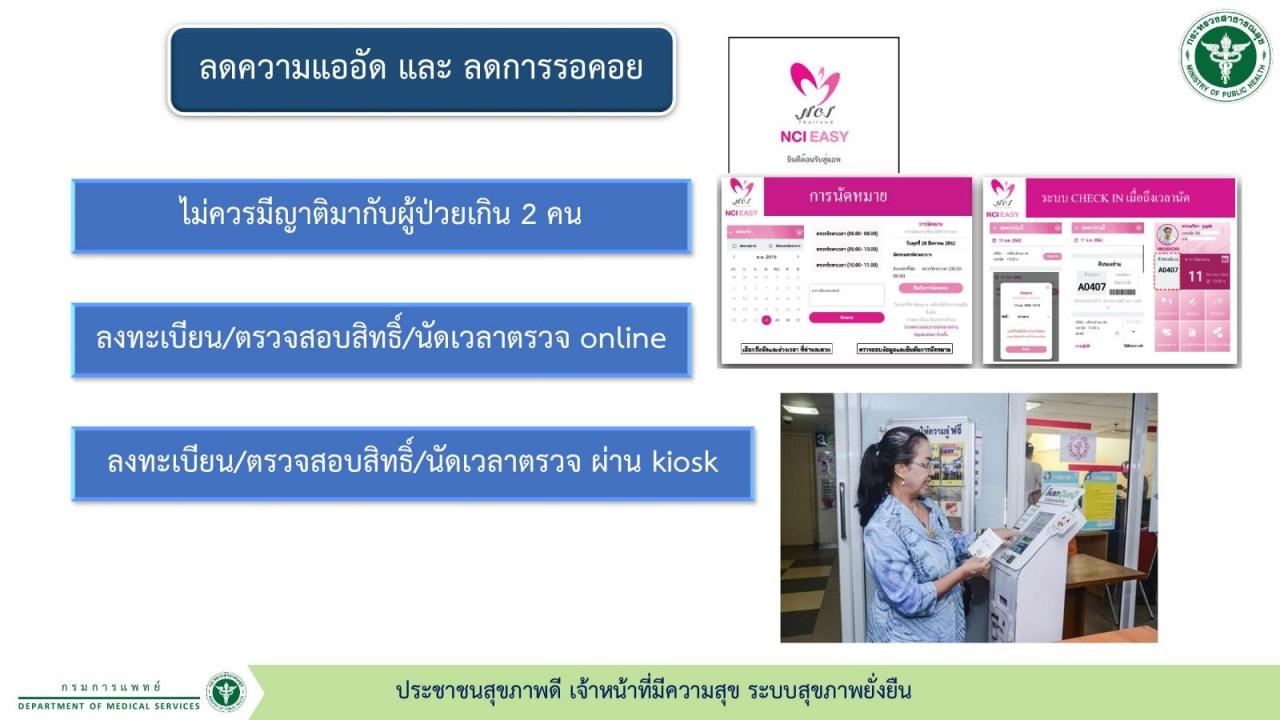 - การลงทะเบียน/ตรวจสอบสิทธิ์/นัดเวลาตรวจ online ก่อนมาโรงพยาบาล หรือผ่าน kiosk (คีออส) เมื่อมาถึงโรงพยาบาลแล้ว