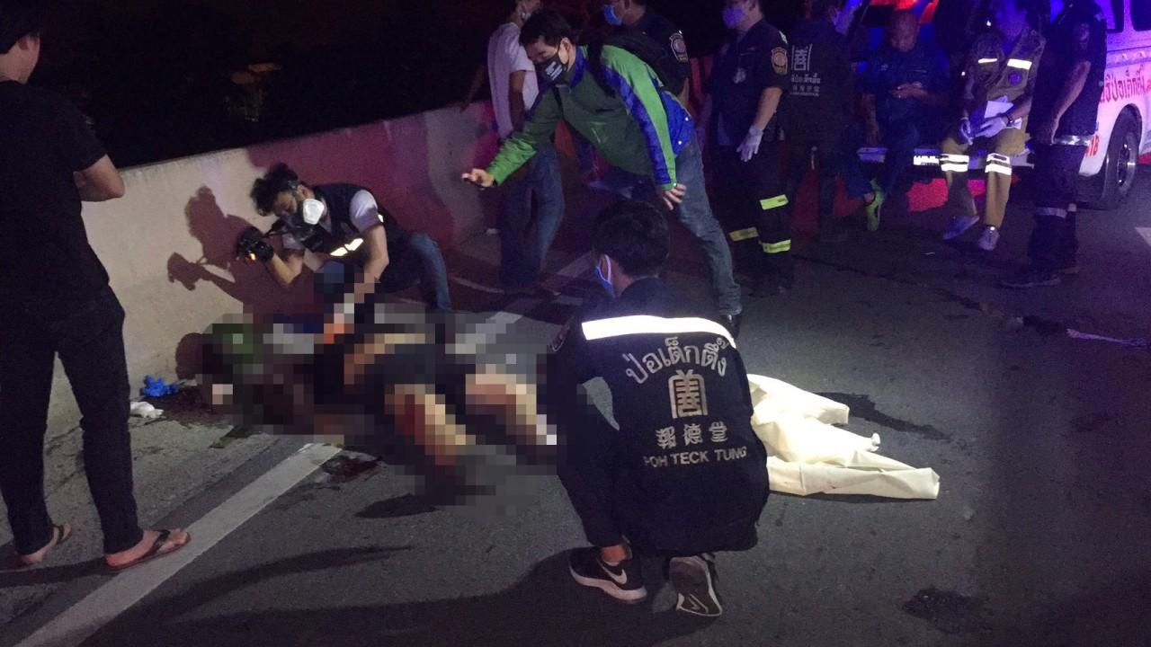 ที่เกิดเหตุเป็นทางลาดลงสะพานมีช่องทางเดินรถ 4 ช่องจราจร โดยในช่องทางซ้ายสุด พบร่างผู้เสียชีวิตเป็นชาย 1 ราย ทราบชื่อต่อมาคือ นายพีรายุ วัฒนมงคล อายุ 34 ปี ชาวบ้านในพื้นที่หมู่ 1 ต.บางกระทึก อ.สามพราน จ.นครปฐม สภาพศพนอนหงายสวมเสื้อยืดแขนสั้นสีดำ นุ่งกางเกงขาสั้นลายพรางสีดำ ใส่หมวกนิรภัยแบบครึ่งใบสีเขียว มีบาดแผลฉกรรจ์จากการถูกกระแทกที่ปาก ฟันหักหลายซี่ และขาขวาช่วงบริเวณหัวเข่าเป็นแผลเปิดจนถึงกระดูก ห่างไปด้านหน้าประมาณ 20 เมตร พบรถจักรยานยนต์บิ๊กไบค์ ยี่ห้อฮอนด้า รุ่น CB400 ซุปเปอร์โฟร์ (Honda CB400 SUPER FOUR) สีขาว-ดำ ทะเบียน กบฉ 618 กรุงเทพมหานคร ของผู้ตายพลิกคว่ำอยู่ ชิ้นส่วนกระจัดกระจายเกลื่อนพื้นถนน