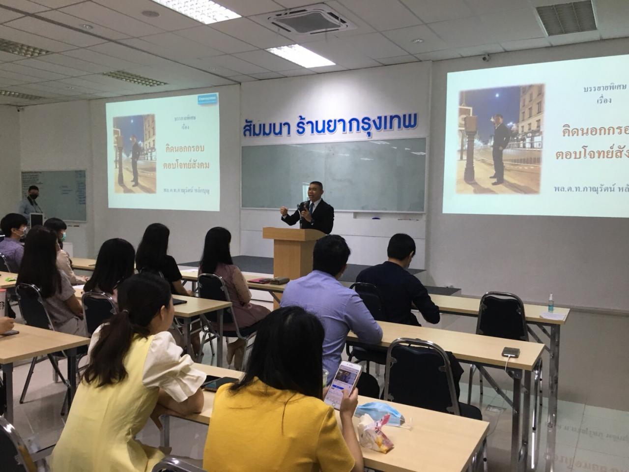 เมื่อเวลา 10.00-11.00 น. วันที่ 22 มิ.ย.63 พล.ต.ท.ภาณุรัตน์ หลักบุญ จเรตำรวจ (สบ.8) ได้รับเชิญจาก บริษัท ยากรุงเทพ ให้มาบรรยายพิเศษในหัวข้อ "คิดนอกกรอบ ตอบโจทย์สังคม" ให้กับเภสัชกรประจำบริษัทจำนวน 140 คน ในโอกาสที่บริษัทฯ จัดสัมมนาให้กับเภสัชกร ในภาวะสถานการณ์โควิด-19 เพื่อรองรับมาตรการต่างๆ ที่รัฐบาลได้ประกาศและกำหนด และลดปัจจัยเสี่ยงต่างๆ ที่จะกระทบกับ บริษัท ยากรุงเทพ.