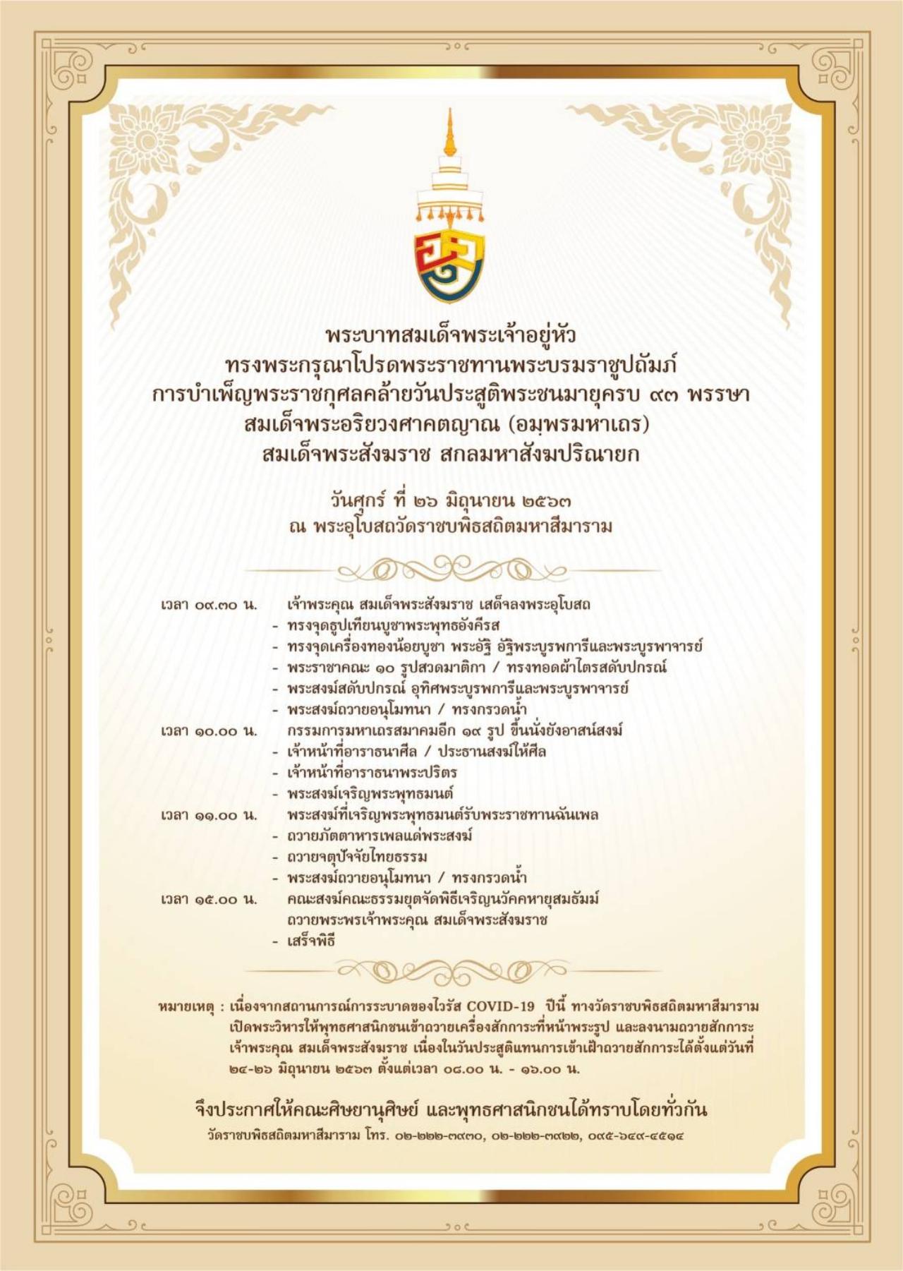 วันที่ 26 มิ.ย. 2563 ผู้สื่อข่าวรายงานว่า แฟนเพจเฟซบุ๊ก สมโภช 150 ปี วัดราชบพิธสถิตมหาสีมาราม ถ่ายทอดสด โดยตามกำหนดการ เวลา 15.00 น. คณะสงฆ์คณะธรรมยุต จัดพิธีเจริญนวัคคหายุสมธัมม์ ถวายพระพรแด่เจ้าพระคุณ สมเด็จพระอริยวงศาคตญาณ (อมฺพรมหาเถร) สมเด็จพระสังฆราช สกลมหาสังฆปริณายก เนื่องในวาระทรงเจริญพระชนมายุ 93 พรรษา ณ วัดราชบพิธสถิตมหาสีมารามราชวรวิหาร ซึ่งเป็นกำหนดการต่อเนื่องจากช่วงเช้าที่ พระบาทสมเด็จพระเจ้าอยู่หัว ทรงพระกรุณาโปรดพระราชทานพระบรมราชูปถัมภ์ การบำเพ็ญพระราชกุศลวันคล้ายวันประสูติ สมเด็จพระสังฆราช