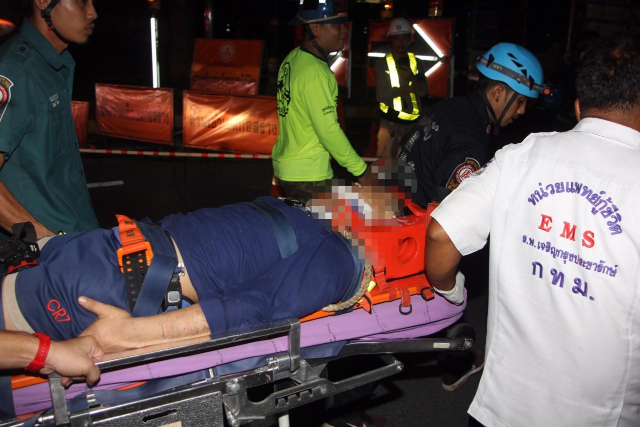 ผู้สื่อข่าวรายงานอีกว่า เจ้าหน้าที่กู้ภัยมองว่าจะไม่ปลอดภัยจึงได้มีการทักท้วงให้ใช้อุปกรณ์กู้ภัยที่ได้มาตรฐานกว่านี้แต่ก็ไม่เป็นผล ใช้เวลานานกว่า 30 นาที จึงยอมยกเลิกการนำผู้บาดเจ็บลงมาด้วยเครน มาเป็นนำผู้บาดเจ็บขึ้นแผ่นกระดานรองหลัง (Spine Board) แล้วใช้กำลังเจ้าหน้าที่มูลนิธิป่อเต็กตึ๊ง 6 นาย เดินแบกมาลงมาที่สถานีช่องนนทรี ซึ่งอยู่ห่างจากจุดเกิดเหตุระยะทางไกลกว่า 1 กิโลเมตร ใช้เวลาเดินอีกกว่า 20 นาที จึงสามารถนำคนเจ็บลงมาสู่พื้นล่างได้สำเร็จ ก่อนถูกนำตัวรักษาต่อที่โรงพยาบาลเลิดสิน ทราบชื่อต่อมานายเนเรียว อายุ 30 ปี สัญชาติเมียนมา