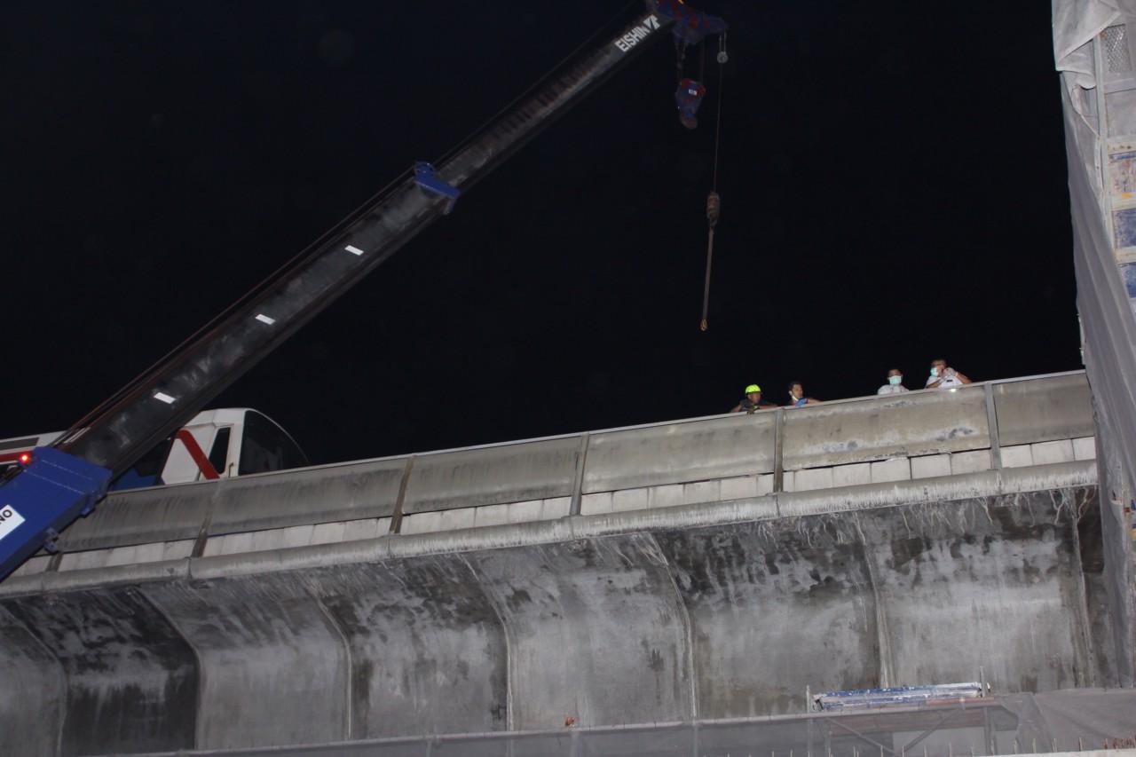 อย่างไรก็ตาม มีรายงานว่า เจ้าหน้าที่กู้ชีพจึงได้ต่อรองขอเฉพาะทีมแพทย์ขึ้นไปดูอาการ เนื่องจากเกรงว่าผู้บาดเจ็บจะมีอาการที่ก่อให้เกิดอันตรายมากกว่านี้ โดยได้รับอนุญาตให้ขึ้นไปเพียง 2 คนเท่านั้น จากการตรวจเบื้องต้นพบผู้บาดเจ็บมีอาการบวมที่สะโพก จำเป็นต้องเคลื่อนย้ายนำส่งโรงพยาบาลเป็นการด่วน โดยทางเจ้าหน้าที่ดูแลการก่อสร้างระบุว่า จะเป็นผู้นำคนเจ็บลงมาเองโดยจะใช้กระบะปูนเกี่ยวกับเครนยกลงมา ส่งทีมแพทย์ที่รออยู่ด้านล่าง