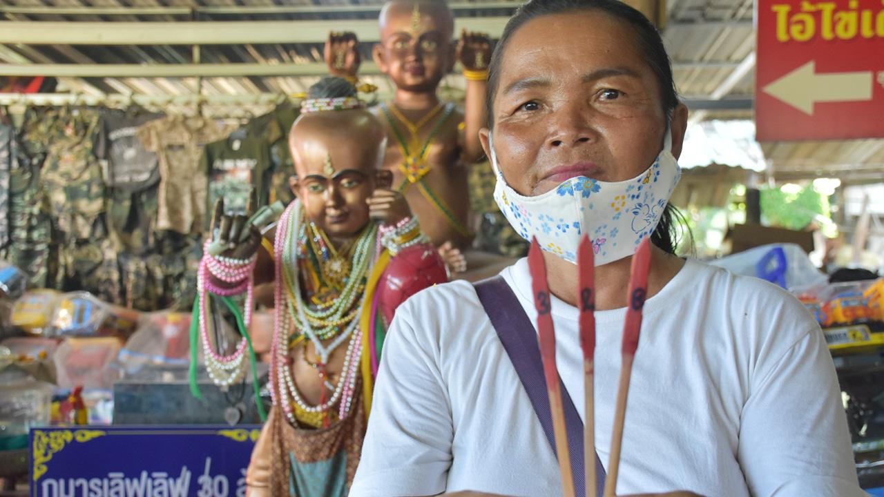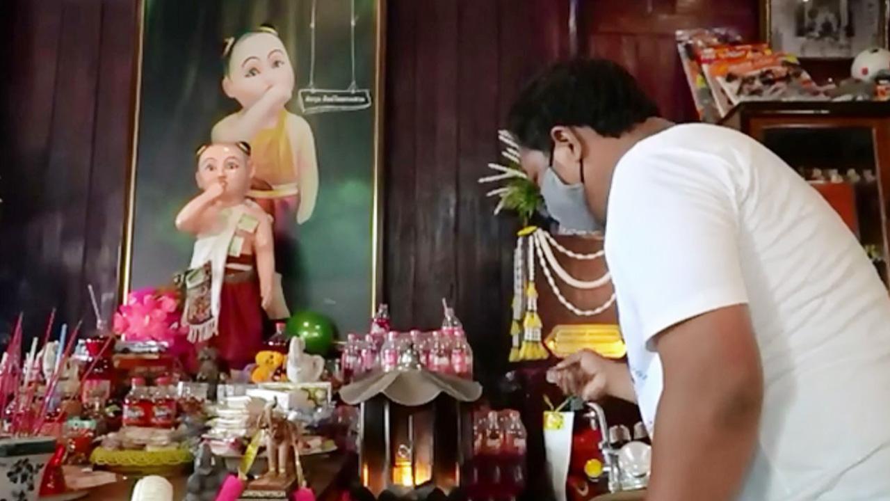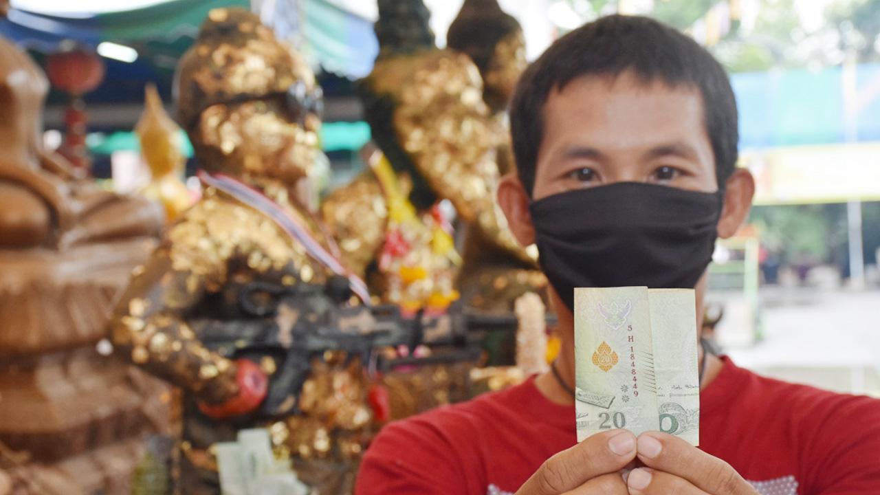 คอหวยได้นำเงินไปแลกเปลี่ยนกับธนบัตรฉบับ 20 บาท เหน็บไว้ตามลำตัว แล้วยกมือพนมขอโชคลาภกับกุมารทองจุกดำ สำหรับธนบัตรที่แลกมาได้ หมายเลขธนบัตร 5 H 1 8 4 8 4 4 9 จะนำหมายเลขในธนบัตรไปสลับเปลี่ยนจับคู่หาซื้อเลขเด็ดตามแผงลอตเตอรี่ หากถูกจะกลับมาแก้บนให้กุมารจุกดำ (เซียนหวยมาขอโชค "กุมารทองจุกดำ" ไม่ผิดหวังได้ "เลขเด็ด" กลับไปลุ้นรวย)