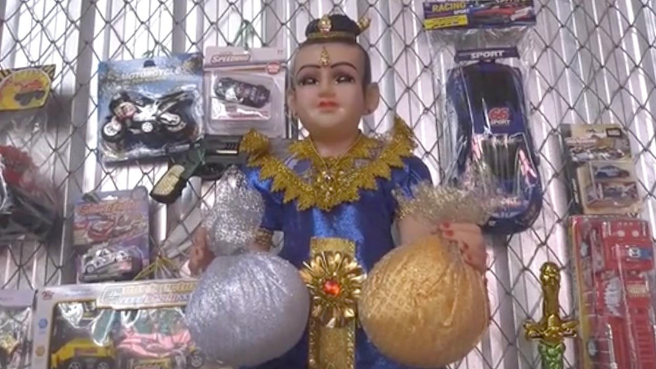 คนโชคดีได้มาแก้บนพร้อมขอเลขเด็ดจากกุมารไอ้จุก วัดประชุมมิตรบำรุง อ.บ้านฉาง ที่ระยอง หลังถูกหวยได้รางวัลใหญ่ ก่อนกลับได้เขย่าติ้วได้ "เลขเด็ด" 27 หากได้โชคสมปรารถนาก็จะนำของเล่นมาแก้บนให้แน่นอน (ชาวบ้านมาขอ "เลขเด็ด" กุมารไอ้จุก หลังให้โชคมาแล้ว 4 งวดติด)