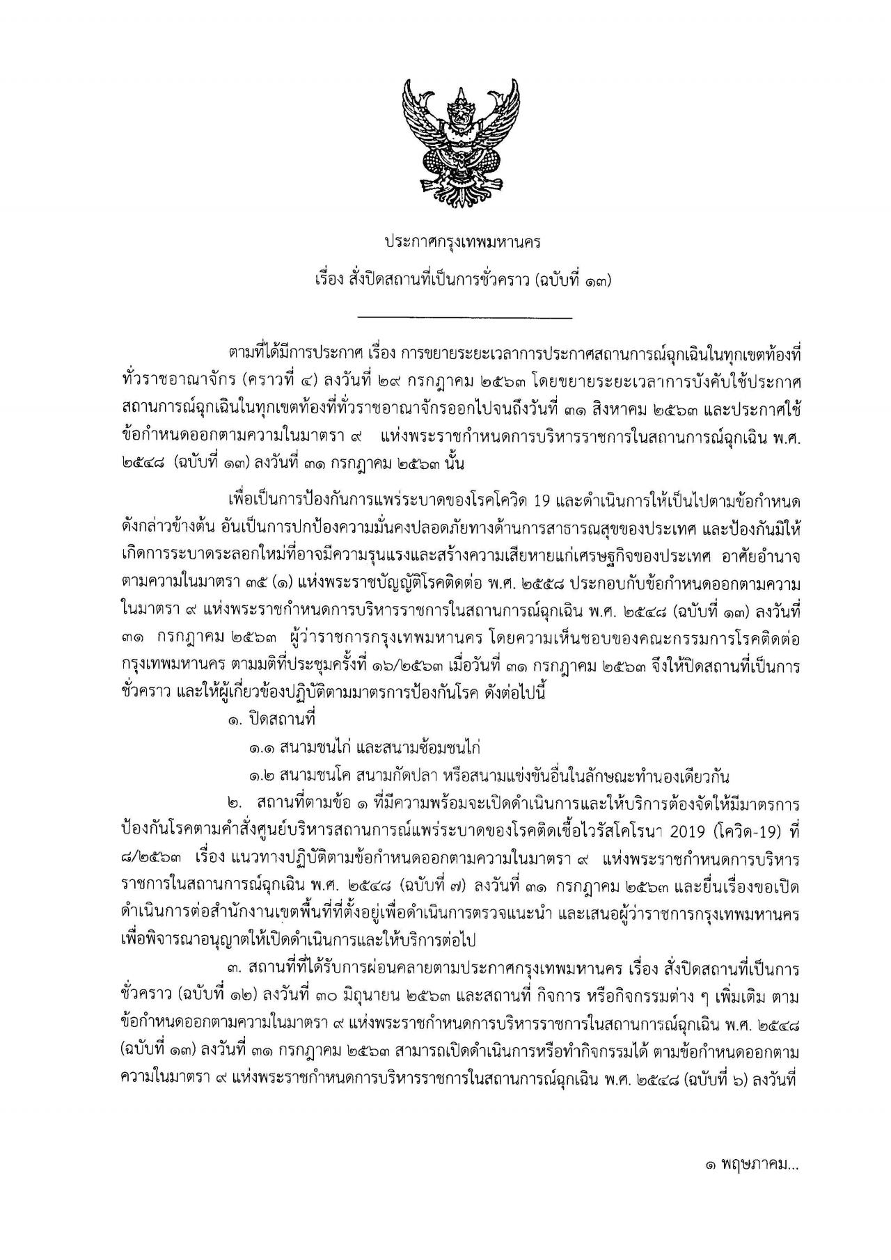 วันที่ 31 ก.ค. พล.ต.อ.อัศวิน ขวัญเมือง ผู้ว่าราชการกรุงเทพมหานคร ได้เซ็นลงนามในหนังสือประกาศกรุงเทพมหานคร เรื่อง สั่งปิดสถานที่เป็นการชั่วคราว (ฉบับที่ 13)