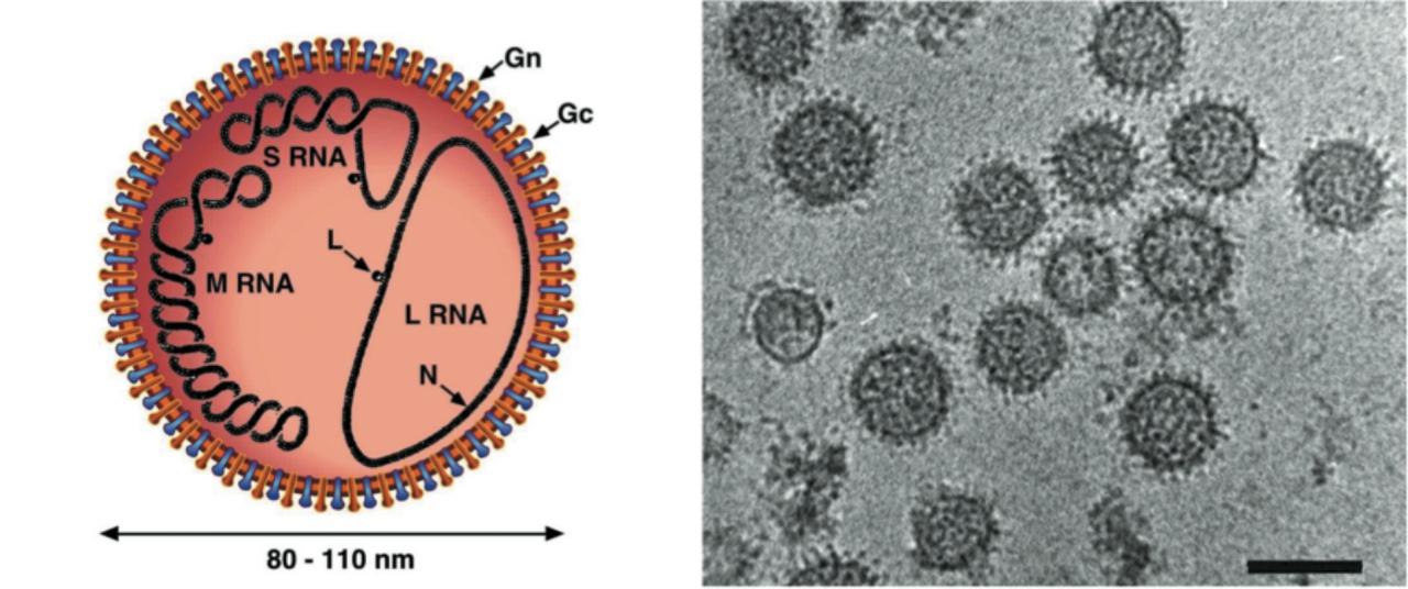 สำหรับโรค SFTS เป็นโรคที่เกิดจากเชื้อไวรัสในตระกูล Bunyavirus ซึ่งมีเห็บเป็นพาหะ ชื่อของไวรัสแบบเป็นทางการยังไม่มี จึงใช้ชื่อว่า SFTS virus (SFTSV) ไปก่อน โดยไวรัสในตระกูลนี้มีสารพันธุกรรมเป็น RNA สายลบ มีสามเส้นเป็นวงขนาดแตกต่างกันไป เส้นยาวสุด ขนาดยาว 6,368 เบส ทำหน้าที่สร้างเอนไซม์ที่ไวรัสใช้เพิ่มจำนวนสารพันธุกรรม เส้นที่สอง ยาว 3,378 เบส ทำหน้าที่สร้างโปรตีนบนเปลือกไวรัส ใช้เข้าสู่เซลล์ และเส้นที่สาม ยาว 1,744 เบส สร้างโปรตีนนิวคลีโอแคปซิด และโปรตีนอื่นๆ ที่ช่วยให้ไวรัสเพิ่มปริมาณได้