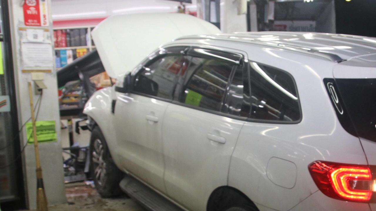 สภาพรถฟอร์ด รุ่นเอฟเวอร์เรสต์ สีขาว ของนายฐานะ โพธิ์สอาด หลังพุ่งชนท้ายรถแท็กซี่ แล้วเสียหลักขึ้นไปชนร้านสะดวกซื้อปากซอยรัชดาฯ 44 มีผู้บาดเจ็บเล็กน้อย 4 คน เป็นพนักงานเซเว่น 2 คน โชเฟอร์แท็กซี่และผู้ โดยสารอีก 2 คน ตำรวจตรวจไม่พบแอลกอฮอล์คนขับเจ้าตัวอ้างเบรกไม่อยู่.
