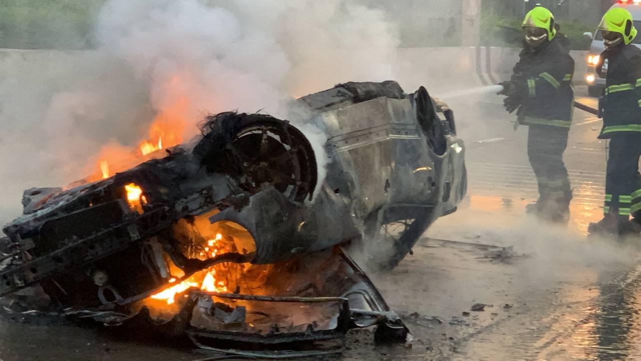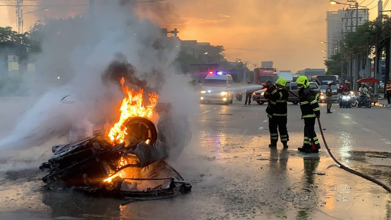 ที่เกิดเหตุเป็นถนน 4 ช่องจราจร จากการตรวจสอบช่องทางเดินรถที่ 3 พบรถยนต์ยี่ห้อเมอร์เซเดส-เบนซ์ ไม่ทราบรุ่น สีบรอนซ์เทา ทะเบียน จก 4000 กรุงเทพมหานคร พลิกคว่ำล้อชี้ฟ้าอยู่กลางถนน มีแสงเพลิงและกลุ่มควันพวยพุ่งออกมาจากห้องเครื่องอย่างรวดเร็วจนลุกลามได้รับความเสียหายทั้งคัน เจ้าหน้าที่ใช้หัวฉีดน้ำเข้าสกัดกั้นนาน 10 นาทีเพลิงจึงสงบ เบื้องต้นผู้ขับขี่รถคันดังกล่าวเป็นชายอายุราว 35-40 ปี ได้รับบาดเจ็บศีรษะแตกเล็กน้อย ขึ้นรถแท็กซี่ไปโรงพยาบาลใกล้เคียงเองก่อนหน้านี้