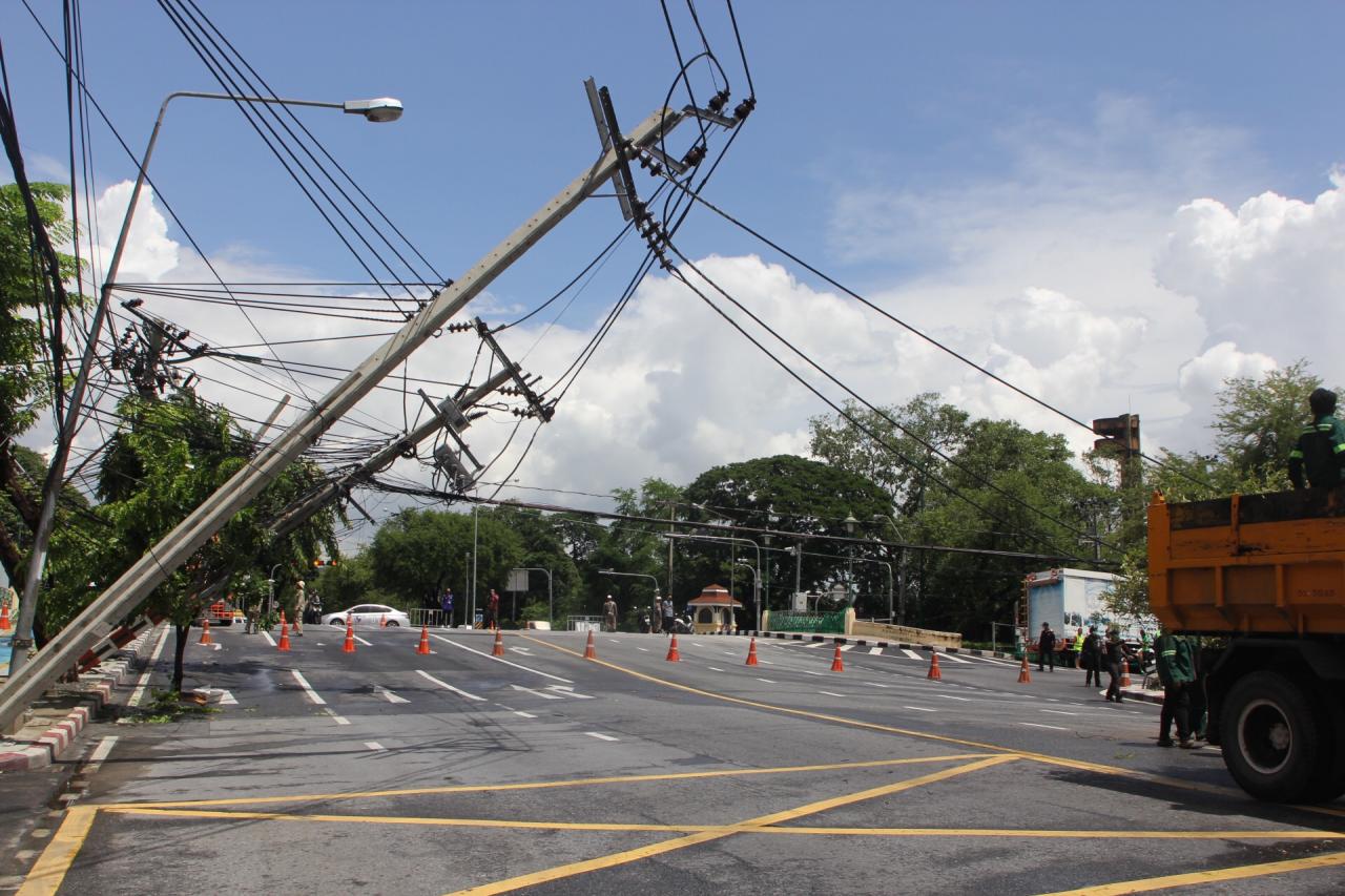 เมื่อเวลา 12.30 น. วันที่ 5 ก.ย. พ.ต.ต.ประสิทธิ เค้าประเสริฐ สว.จร.สน.ดุสิต ได้รับแจ้งเหตุเสาไฟฟ้าหักโค่นจำนวนหลายต้น ทำให้มีสายไฟพาดกลาง บริเวณแยกวัดเบญจมบพิตร ถนนศรีอยุธยา แขวงและเขตดุสิต กทม. จึงรุดตรวจสอบพร้อมประสานเจ้าหน้าที่การไฟฟ้านครหลวง ไปตรวจสอบ