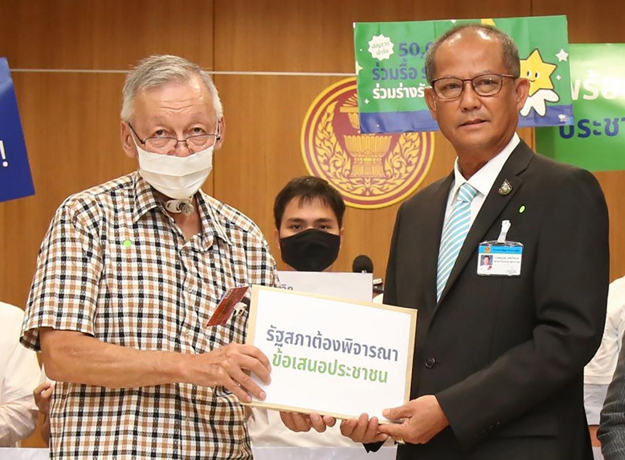 นายจอน อึ๊งภากรณ์ ผอ.โครงการอินเตอร์เน็ตเพื่อกฎหมายประชาชน (ไอลอว์) นำรายชื่อประชาชน 70,276 ชื่อ ยื่นให้นายสมบูรณ์ อุทัยเวียนกุล เลขานุการ ประธานสภาฯเสนอต่อประธานสภาฯพิจารณาประกอบการแก้ไขรัฐธรรมนูญ โดยมีกลุ่มเยาวชนยืนชูป้ายหนุน.