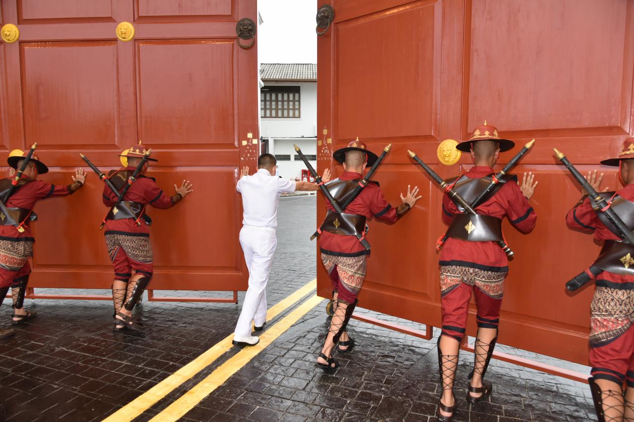ต่อมาในสมัย พล.ร.อ.ประเสริฐ บุญทรง ผู้บัญชาการทหารเรือ เมื่อครั้งดำรงตำแหน่งเสนาธิการทหารเรือ ระหว่างปี พ.ศ.2541 ถึง 2542 ได้มีการเสนอแนวความคิด พิจารณาปรับปรุงประตูทางเข้าออก กองบัญชาการกองทัพเรือพระราชวังเดิม เนื่องจากปัญหาความแออัดของสถานที่จอดรถ ในบริเวณพระราชวังเดิม และความคับแคบ พร้อมทั้งสร้างอาคารกองรักษาการณ์ขนาดกว้าง 8 เมตรยาว 20 เมตรสูง 3 ชั้น ซึ่งอาคารนี้ประกอบด้วยกองรักษาการณ์ ห้องอาหาร และที่พักผ่อนของกำลังพลในเขตพระราชวังเดิม ตลอดจนผู้มาพักติดต่อและพักรอการประชุม โดยงบประมาณส่วนหนึ่งได้รับการสนับสนุนจากธนาคารทหารไทย โดยการก่อสร้างประตูได้เริ่มขึ้นเมื่อวันที่ 2 มิถุนายน 2544 และแล้วเสร็จเมื่อวันที่ 15 พฤศจิกายน 2544 โดยมีพิธีเปิดประตูกองบัญชาการกองทัพเรือแห่งนี้ เมื่อวันที่ 20 พฤศจิกายน 2544.