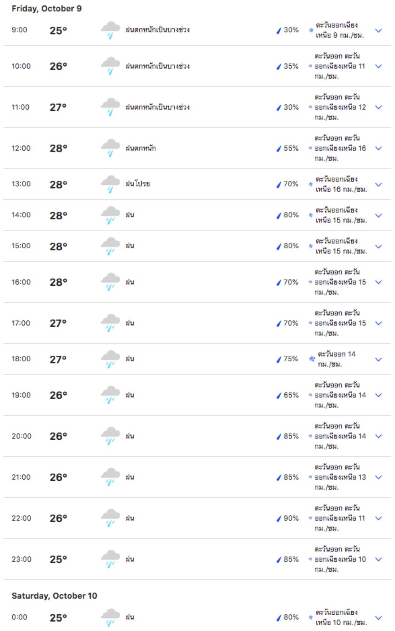 จากการตรวจสอบสภาพอากาศรายชั่วโมง จากเว็บไซต์ weather.com พบว่า ตลอดทั้งวันหลายพื้นที่ใน กทม. จะเจอฝนตกหนักช่วงเวลาระหว่าง 11.00-13.00 น. ฝนโปรยในช่วงบ่าย และคาดว่าจะมีฝนตกต่อเนื่องไปจนถึงวันพรุ่งนี้
