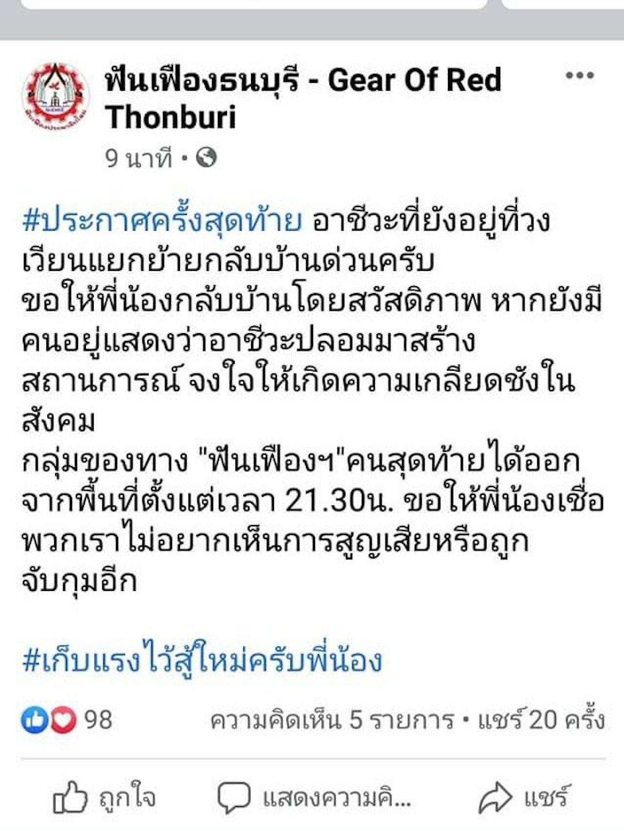 “กลุ่มของทาง ฟันเฟืองฯ คนสุดท้ายได้ออกจากพื้นที่ตั้งแต่เวลา 21.30 น. ขอให้พี่น้องเชื่อพวกเรา ไม่อยากเห็นการสูญเสียหรือถูกจับกุมอีก”.