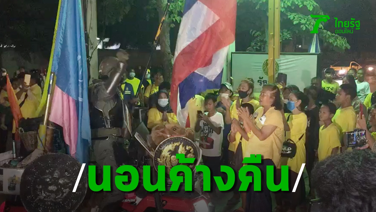 กลุ่มคนรักสถาบันเตรียมนอนค้างคืนที่ทางเข้าอาคารรัฐสภาหลังใหม่ โดยมีรถสุขาเคลื่อนที่ และรถไฟฟ้าเปิดไฟส่องสว่างของ กทม. หลายคันคอยอำนวยความสะดวก