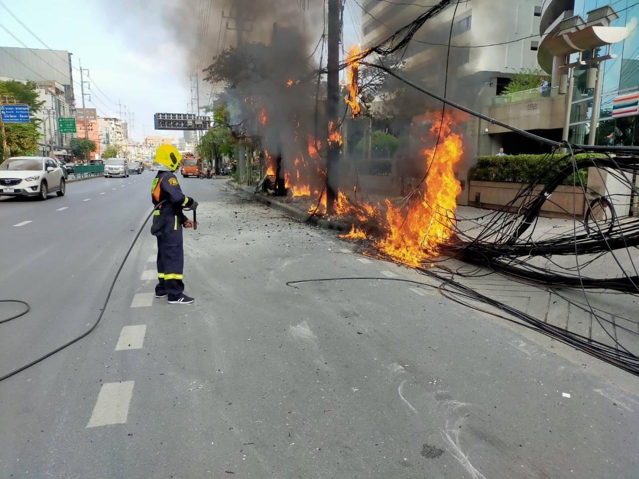 โดยเพลิงได้ลุกลามไปตามสายเคเบิลสื่อสาร และลุกลามไปยังต้นไม้ริมถนน เป็นทางยาวประมาณ 10 เมตร เจ้าหน้าที่จึงประสานเจ้าหน้าที่การไฟฟ้านครหลวงเข้าตรวจสอบ เพื่อทำการตัดไฟในบริเวณดังกล่าว ทำการปิดการจราจรบริเวณจุดเกิดเหตุ พร้อมนำสารเคมีดับเพลิงเข้าทำการระงับใช้เวลา 10 นาทีเพลิงจึงสงบ