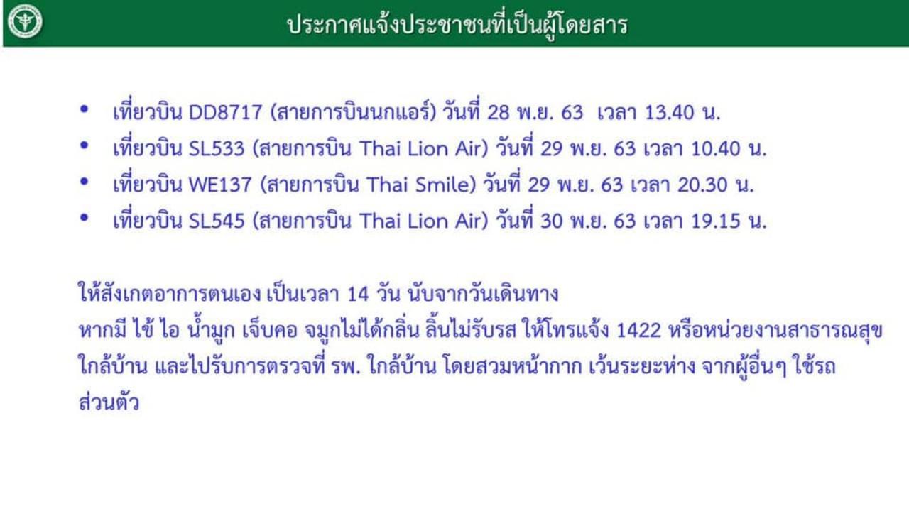 วันที่ 6 ธ.ค. 2563 กระทรวงสาธารณสุข ประกาศแจ้งประชาชนที่เป็นผู้โดยสาร หากใครเดินทางใน 4 เที่ยวบินนี้ซึ่งมีผู้ป่วยติดเชื้อโควิด-19 ให้สังเกตอาการตัวเอง 14 วัน นับจากวันเดินทาง หากมีไข้ ไอ น้ำมูก เจ็บคอ จมูกไม่ได้กลิ่น ลิ้นไม่รับรส ให้แจ้งสายด่วยกรมควบคุมโรค หมายเลข 1422 หน่วยงานสาธารณสุขใกล้บ้าน หรือเข้ารับการตรวจที่โรงพยาบาลใกล้บ้าน รวมถึงสวมหน้ากาก เว้นระยะห่างจากผู้อื่น และใช้รถส่วนตัว ซึ่งทั้ง 4 เที่ยวบินมีดังนี้