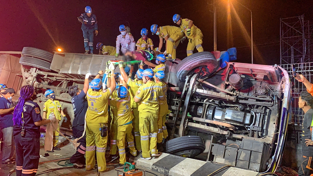 เจ้าหน้าที่มูลนิธิป่อเต็กตึ๊งลำเลียงผู้บาดเจ็บส่งโรงพยาบาล หลังรถบัสหมอลำคณะศิลปินภูไท ปีนขอบแบริเออร์จนพลิกคว่ำ ที่มอเตอร์เวย์ มุ่งหน้าบางปะอิน เขตคลองสามวา กทม. ทำให้มีผู้บาดเจ็บ 31 คน และเสียชีวิต 2 ศพ.