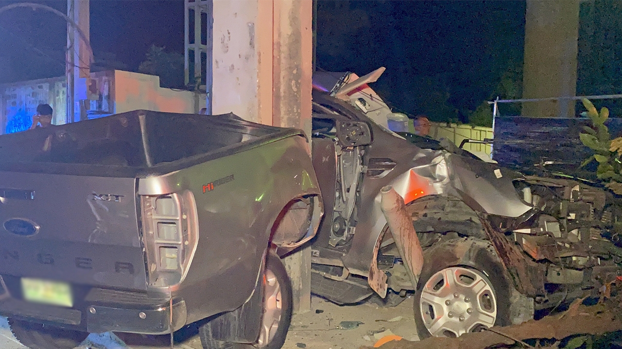 สภาพรถกระบะฟอร์ดเรนเจอร์ ไฮแลนเดอร์ สีเทา หมายเลขทะเบียน บบ 5353 พิจิตร เสียหลักชนเสาไฟฟ้าขาด 2 ท่อน เหตุเกิดบนถนนรัชดาภิเษก ขาเข้า ตรงข้ามศาลอาญา คนขับอาการสาหัส.