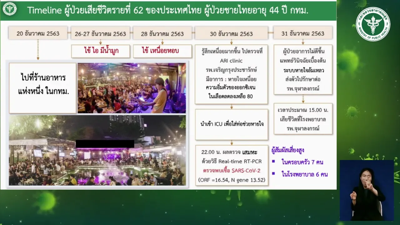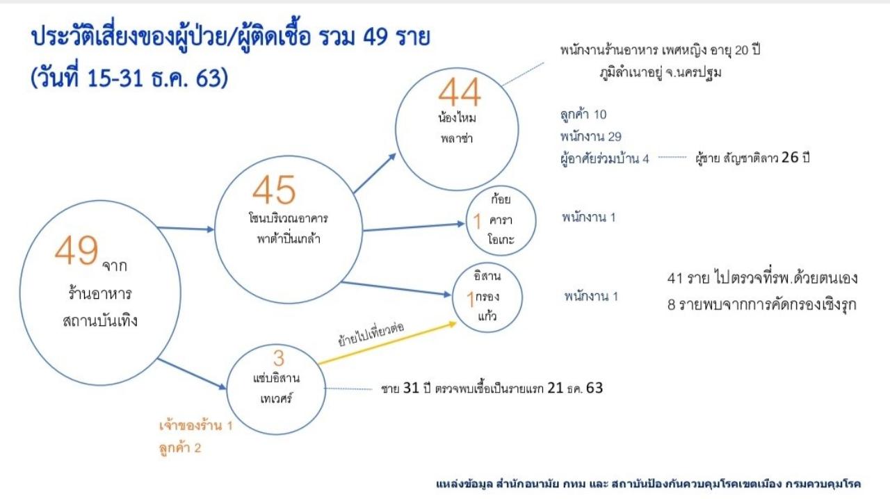 ทั้งนี้มีข้อมูลที่น่าสนใจหลังสอบสวนพบผู้ป่วยแล้วมี 1 รายที่เพิ่งพบเพิ่มเติม คือรายที่ 49 จากกรณีนี้คือผู้เสียชีวิตศพที่ 62 ซึ่ง ศบค.รายงานวันนี้ โดยผู้ป่วยเป็นชายอายุ 44 ปี พบประวัติป่วยมาแล้วตั้งแต่วันที่ 26 ธ.ค. หลังจากไปร้านดังกล่าวเมื่อวันที่