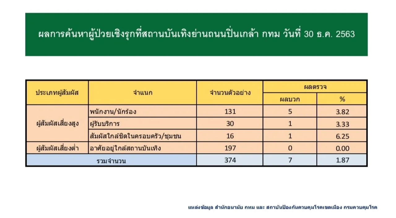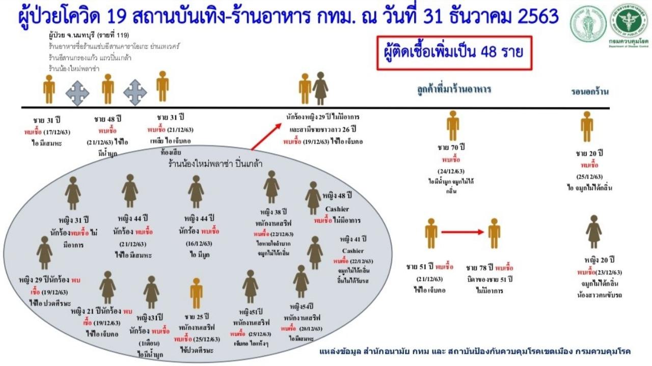 เมื่อเวลา 15.00 น. วันที่ 1 ม.ค. 2564 นพ.โอภาส การย์กวินพงศ์ อธิบดีกรมควบคุมโรค และ นพ.โสภณ เอี่ยมศิริถาวร ผู้อำนวยการกองโรคติดต่อทั่วไป ปฏิบัติหน้าที่รองอธิบดีกรมควบคุมโรค ร่วมกันแถลงที่กระทรวงสาธารณสุข ถึงผู้ติดเชื้อกรณีสถานบันเทิง-ร้านอาหารบริเวณปิ่นเกล้า เขตบางพลัด กทม. ตั้งแต่วันที่ 17-31 ธ.ค. 2563 ซึ่งจากการสอบสวนโรคเพิ่มเติมมีรายละเอียดดังนี้