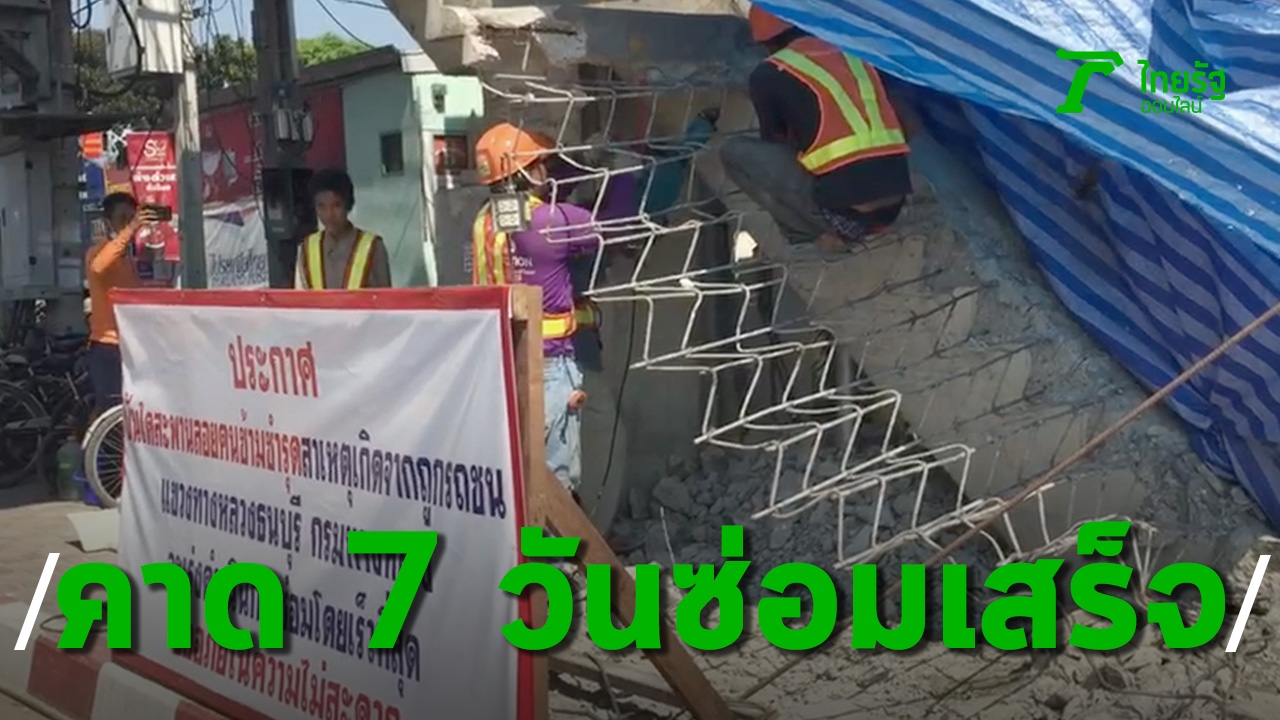 แขวงทางหลวงธนบุรี เร่งซ่อมแซมสะพานลอย ปากทางถนนแสมดำ ตัด ถนนพระรามที่ 2 ที่รถหรูพุ่งชนพังเสียหาย จนคนต้องขึ้นสะพานแบบทุลักทุเล ล่าสุด จนท.ลงมือซ่อมแล้ว คาดว่าจะแล้วเสร็จใน 7 วัน