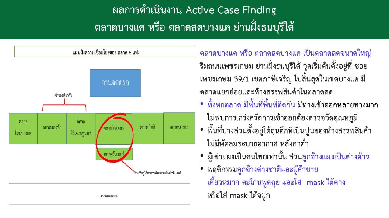- 5 มี.ค. 2564 ไปตรวจที่โรงพยาบาลใน กทม. และเมื่อมีการรายงานไปยังศูนย์บริการสาธารณสุข 40 บางแค ก็รีบลงพื้นที่สอบสวนโรคทันที เบื้องต้นไปที่ตลาดวันเดอร์ เริ่มเก็บตัวอย่างจากสมาชิกครอบครัว แผงติดๆ กันก่อน พบติดเชื้อ 11 ราย