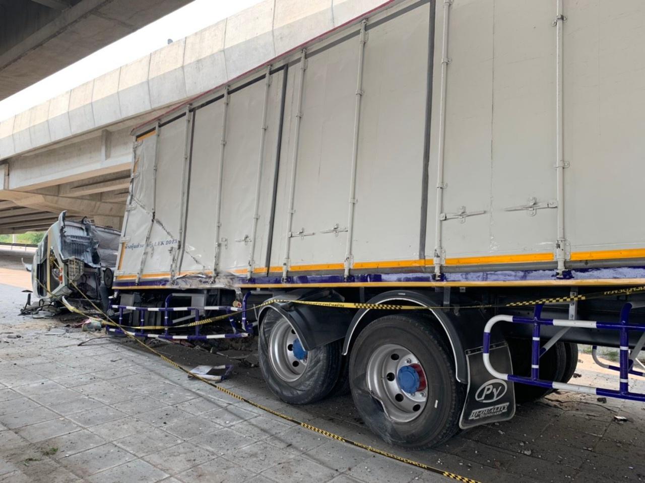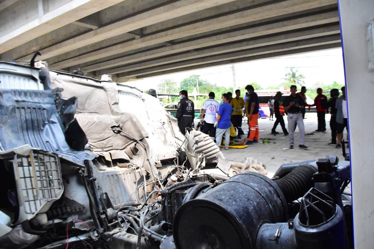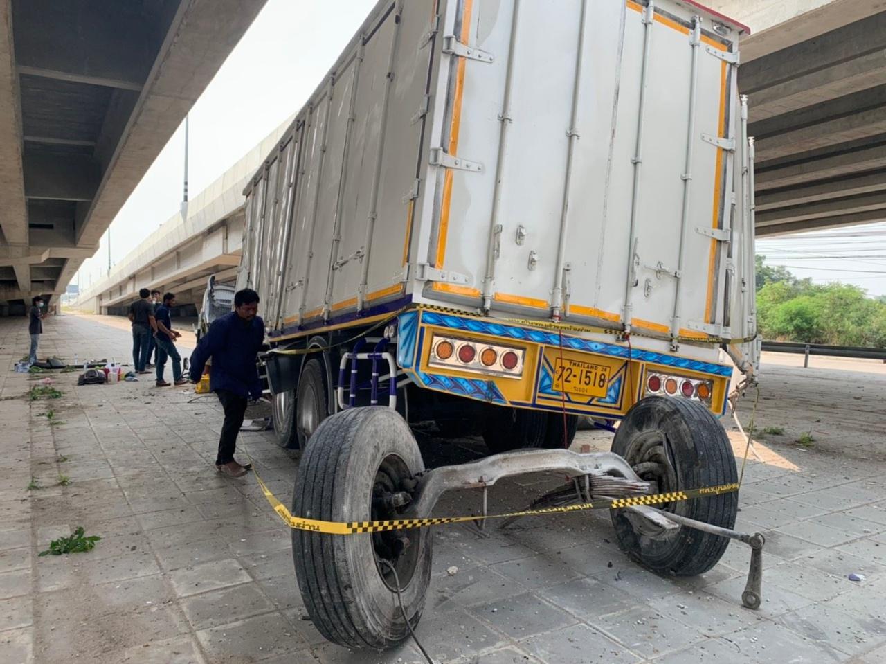 ที่เกิดเหตุอยู่บริเวณพื้นถนนสุวินทวงศ์ ช่องระหว่างกลางของสะพานแยกขนส่งพื้นที่ 4 พบรถบรรทุกสิบล้อ บรรทุกตู้ทึบยี่ห้ออีซูซุ สีขาว ทะเบียน 17-1518 ระยอง ของห้างหุ้นส่วนจำกัด LEK 2013 รับจ้างส่งสินค้าของบริษัทซีพีเอฟ ตกลงมาจากสะพานข้ามแยกดังกล่าว มีความสูงประมาณ 10 เมตร สภาพหน้ารถพังยับเยิน กระจกหน้าแตกยับ ล้อคู่หน้าพับไปอยู่ด้านท้าย พบร่างนายปราโมทย์ รุ่งสว่าง อายุ 50 ปี เป็นคนขับรถบาดเจ็บสาหัส จากแรงกระแทก เจ้าหน้าที่กู้ภัยนำส่งโรงพยาบาลเวชการุณย์รัศมิ์ (หนองจอก) ก่อนนายปราโมทย์เสียชีวิตในเวลาต่อมา