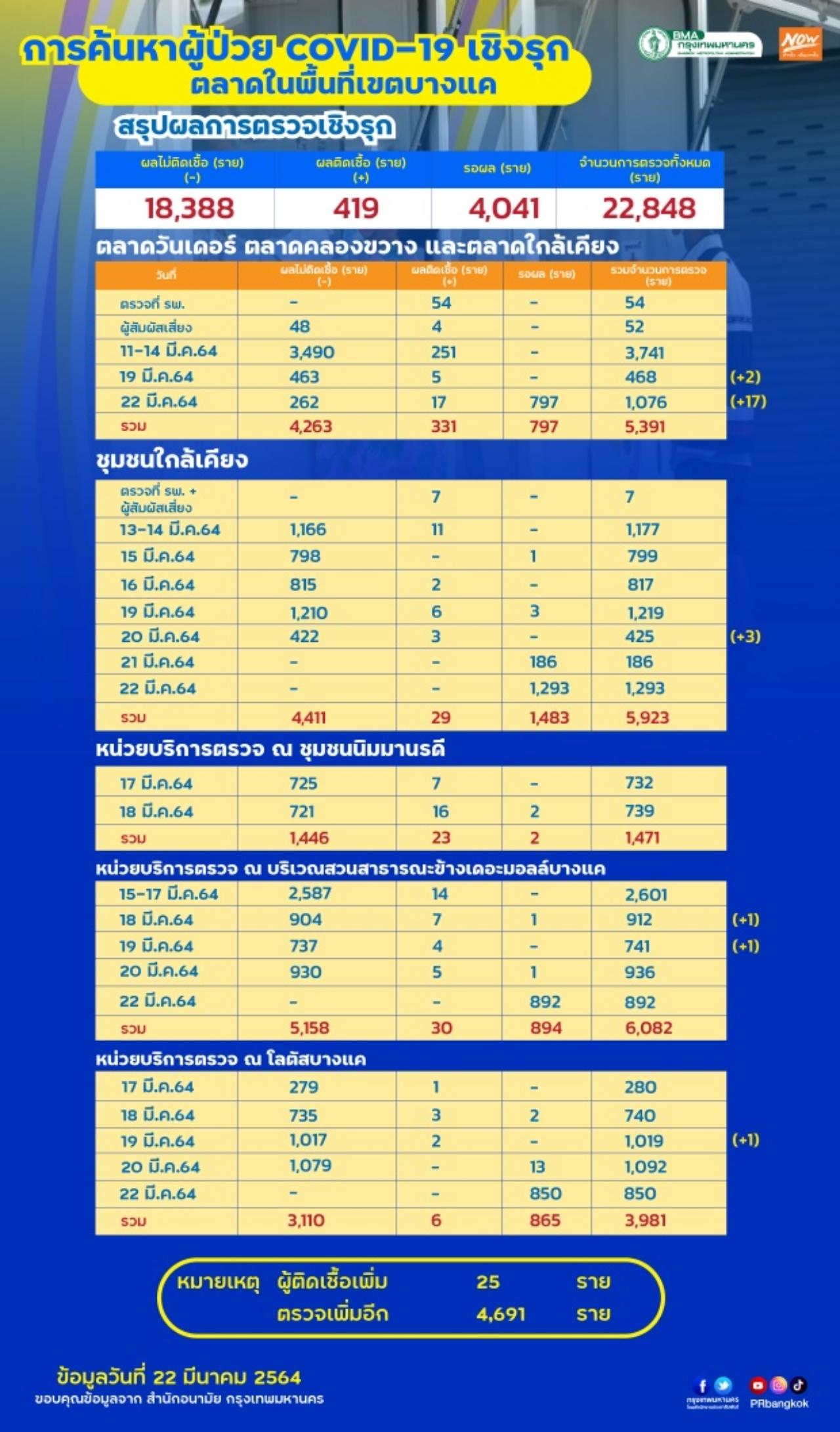 วันที่ 23 มี.ค. 2564 กรุงเทพมหานคร เผยความคืบหน้าการตรวจเชิงรุกหาผู้ติดเชื้อโควิด-19 กรณีคลัสเตอร์ตลาดบางแค (ข้อมูล ณ วันที่ 22 มี.ค. 2564) ตรวจเพิ่ม 4,691 ราย พบผู้ติดเชื้อ 25 ราย