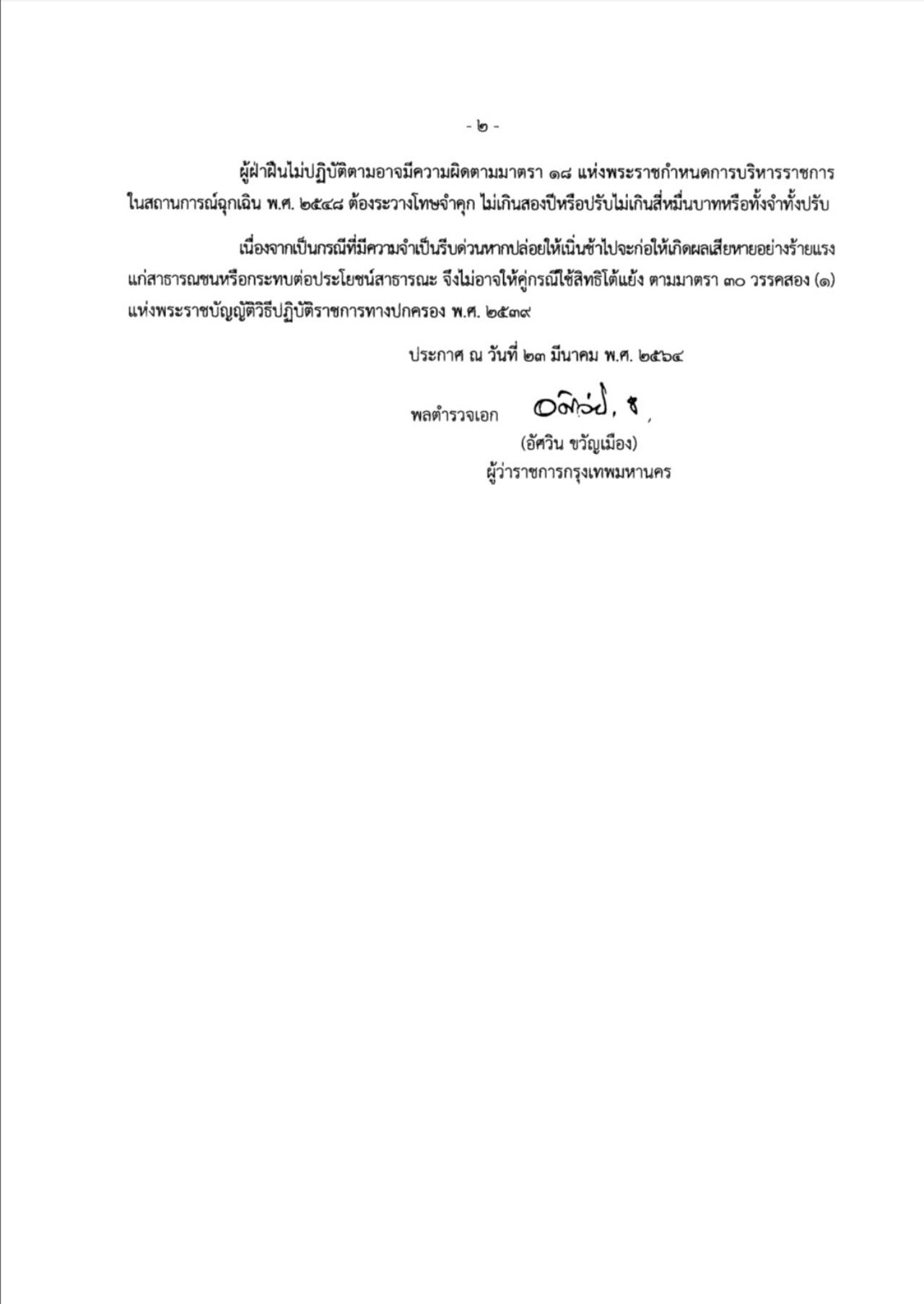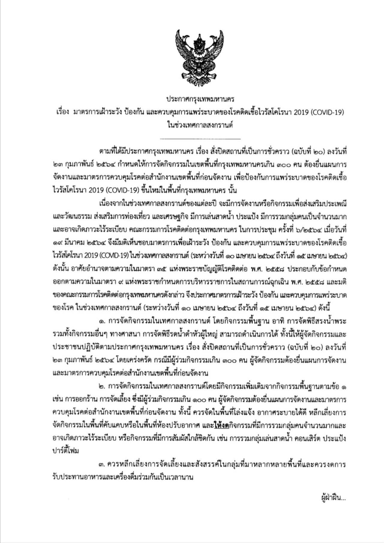 กทม. ออกประกาศควบคุมการแพร่ระบาดโควิด-19 ในช่วงเทศกาลสงกรานต์ 10-15 เม.ย. 64 ฝ่าฝืนมีโทษ