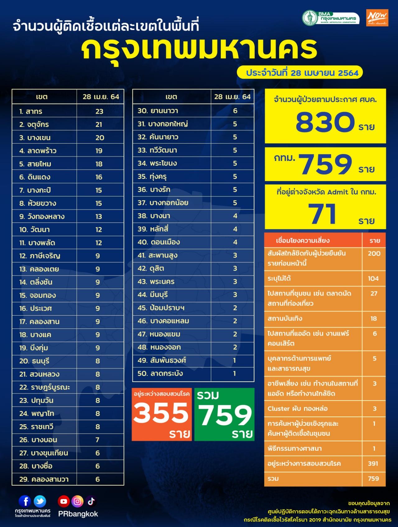 วันที่ 28 เม.ย. 2564 เฟซบุ๊ก กรุงเทพมหานคร โดยสำนักงานประชาสัมพันธ์ อัปเดตข้อมูลจำนวนผู้ติดเชื้อ โควิด-19 ในพื้นที่กรุงเทพมหานคร โดยระบุว่า กทม.พบผู้ติดเชื้อ COVID-19 วันนี้ เพิ่ม 830 ราย อยู่ระหว่างการสอบสวนโรค 355 ราย ซึ่งมีรายละเอียดจำนวนผู้ติดเชื้อแต่ละเขต ดังนี้