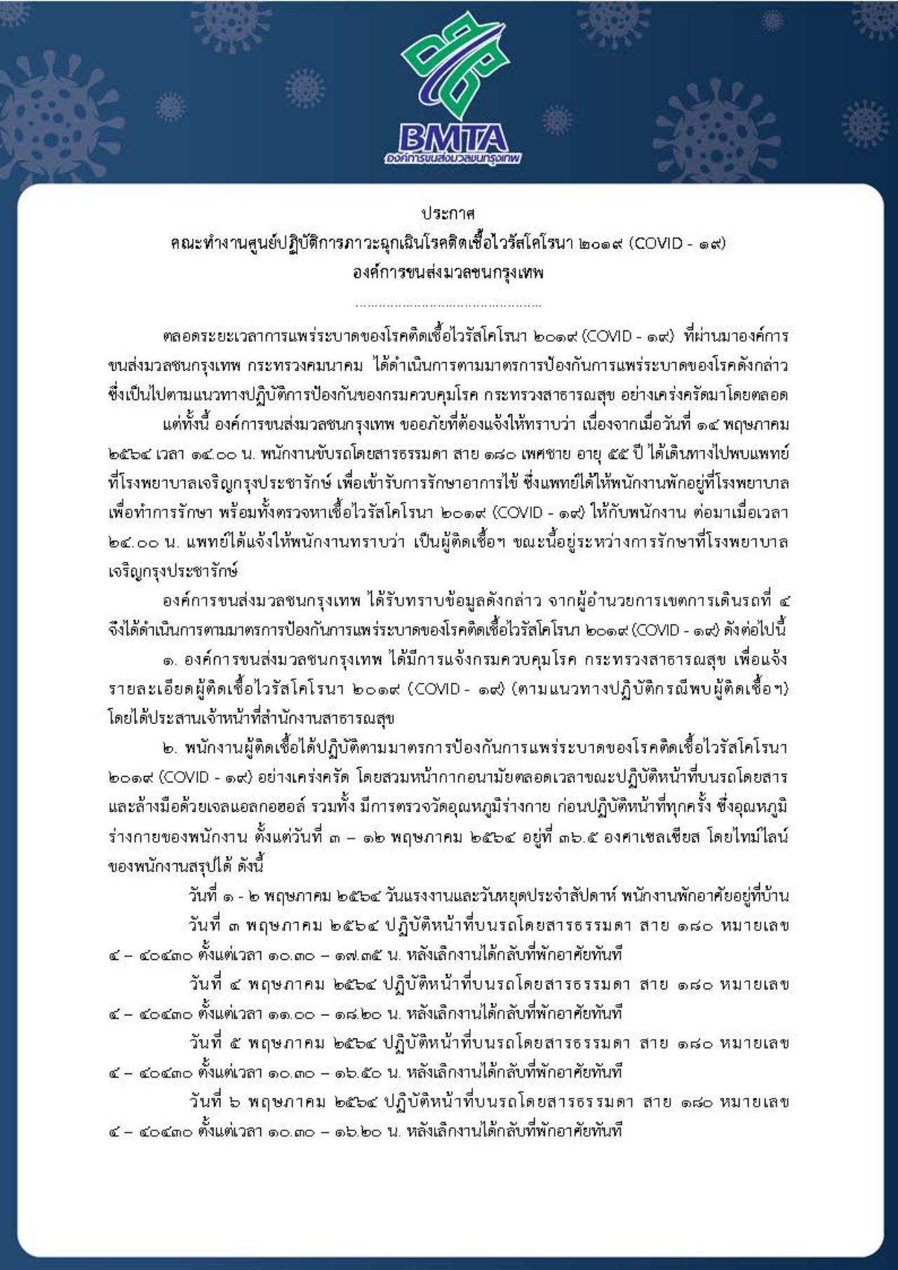 วันที่ 15 พ.ค. 2564 องค์การขนส่งมวลชนกรุงเทพ (ขสมก.) ออกประกาศคณะทำงานศูนย์ปฏิบัติการภาวะฉุกเฉินโรคติดเชื้อไวรัสโคโรนา 2019 (โควิด-19) กรณี พนักงานขับรถโดยสารธรรมดา สาย 180 เพศชาย อายุ 55 ปี เขตการเดินรถที่ 4 อู่สาธุประดิษฐ์ (ปฏิบัติหน้าที่ขับรถโดยสารช่วงกะเช้า) ติดเชื้อโรคไวรัสโควิด-19