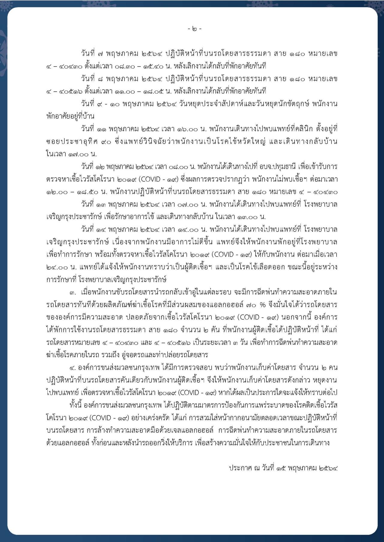 ทั้งนี้ ตรวจพบว่ามีพนักงานเก็บค่าโดยสาร 2 คน ที่ปฏิบัติหน้าที่บนรถคันเดียวกับผู้ติดเชื้อ จึงให้หยุดงานและไปรับการตรวจหาเชื้อ และจะแจ้งความคืบหน้าต่อไป.