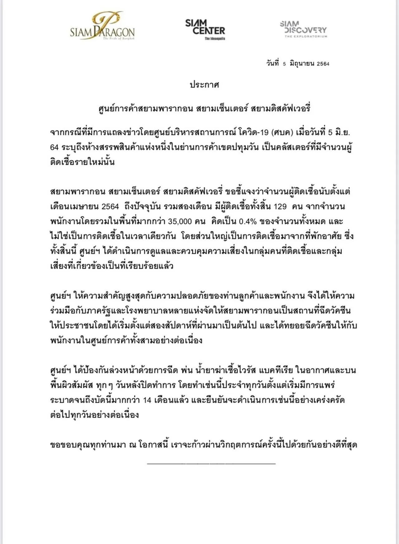 สยามพารากอน สยามเซ็นเตอร์ สยามดิสคัฟเวอรี่ ขอชี้แจงว่าจำนวนผู้ติดเชื้อนับตั้งแต่เดือนเมษายน 2564 ถึงปัจจุบัน รวม 2 เดือน มีผู้ติดเชื้อทั้งสิ้น 129 คน จากจำนวนพนักงานโดยรวมในพื้นที่มากกว่า 35,000 คน คิดเป็น 0.4% ของจำนวนทั้งหมด