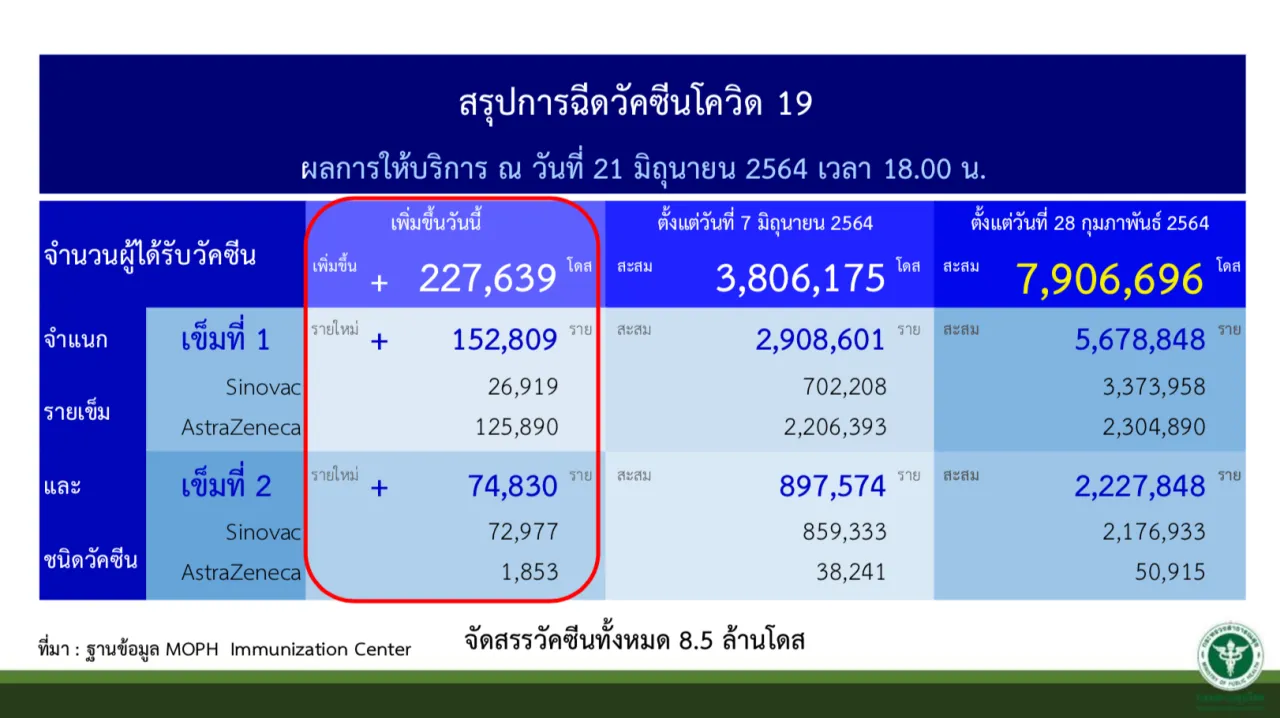 - ผู้ได้รับวัคซีนเข็มที่ 1 จำนวน 5,678,848 ราย แบ่งเป็นซิโนแวค 3,373,958 ราย แอสตราเซเนกา 2,304,890 ราย