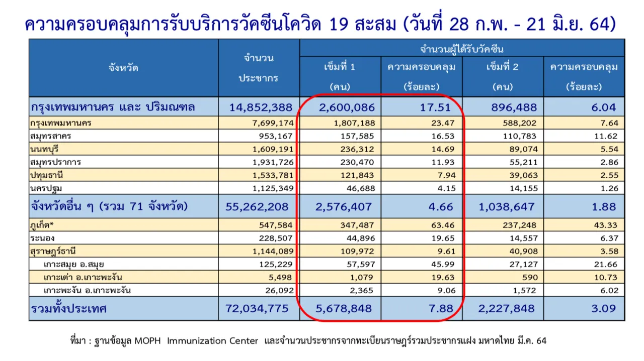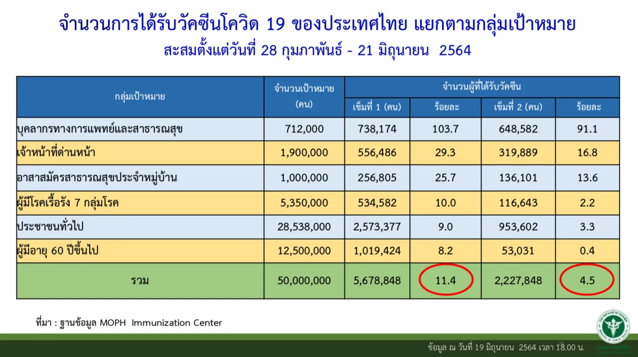 วันที่ 22 มิ.ย. 2564 นายแพทย์ทวีศิลป์ วิษณุโยธิน โฆษกศูนย์บริหารสถานการณ์การแพร่ระบาดของโรคติดเชื้อไวรัสโคโรนา 2019 (โควิด-19) หรือ ศบค. รายงานความคืบหน้าการฉีดวัคซีนโควิด-19 ในประเทศไทย ข้อมูล ณ วันที่ 21 มิ.ย. 2564 เวลา 18.00 น. ที่ผ่านมาเป็นดังนี้