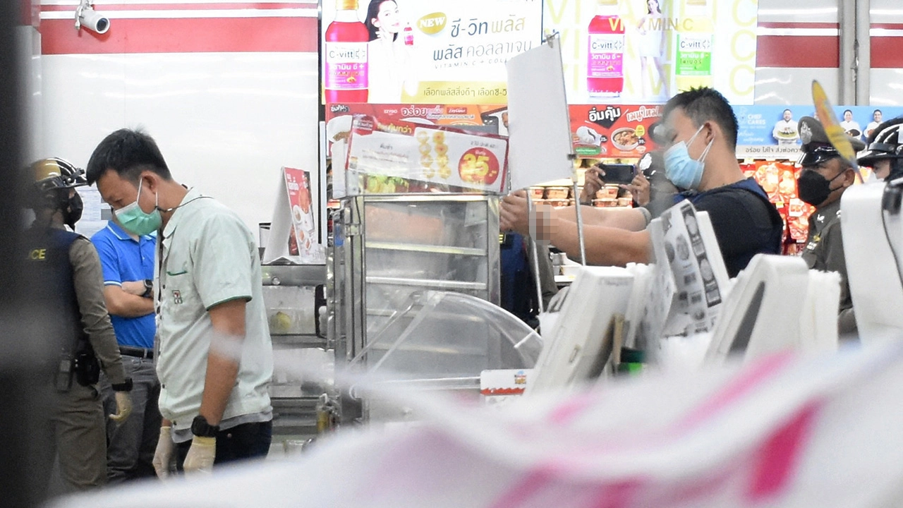 นายกวิน แสงนิลกุล (เสื้อยืดสีดำ) ทำท่าทางยิงนายรัฐวิทย์ สันติคุปตพงศ์ พนักงานร้านสะดวกซื้อ เซเว่นอีเลฟเว่น สาขาปากซอยลาดพร้าว 25 เสียชีวิตเป็นศพแรก ขณะถูกตำรวจ สน.พหลโยธิน คุมตัวไปทำแผนประกอบคำรับสารภาพ.